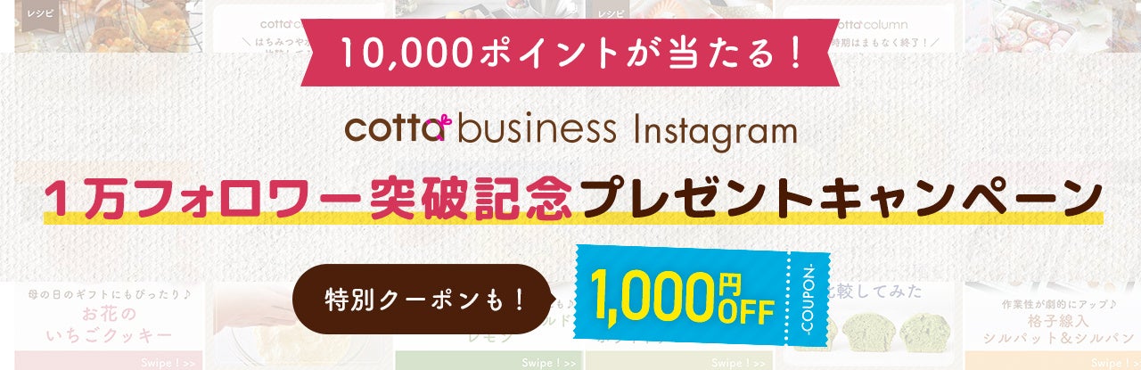 製菓・製パン用の材料・レシピなど2万点以上取り扱う日本最大級のECサイト「cotta(コッタ)」(https://www.cotta.jp/)および、法人様に向けたネット通販サイト「cotta business(コッタビジネス)」(https://www.cotta.jp/business/business_customers.html)を展開する株式会社cotta(所在地:大分県津久見市、代表取締役社長:黒須 綾希子)は、cotta businessのInstagramフォロワー1万人突破を記念して2023年5月17日(水)〜5月31日(水)まで、特別キャンペーンを実施しています。