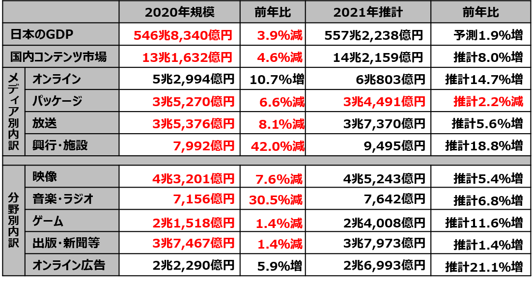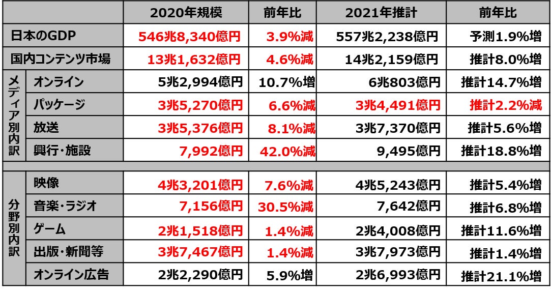 2021年の国内コンテンツ市場の拡大を支えたのは、映像・音楽配信やスマホ向けゲーム、電子出版等のオンラインコンテンツとオンライン広告で、コロナ禍で打撃を受けたテレビ放送や映画館、カラオケ、アーケードゲーム等の分野は、回復傾向にあるもののコロナ禍前の規模には至らなかった。印刷の書籍販売は微増となったが、コロナ禍前から減少傾向にある映像ソフト、新聞は減少を続けた。2020年に伸びた家庭用ゲームソフトは減少に転じた。