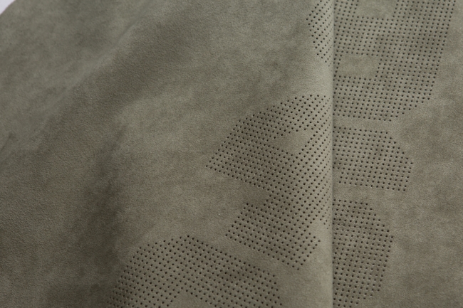 最後のテーマは明らかに男性的な特徴を持つデザインで、世界最大の砂の島、オーストラリアのフレーザー島よりインスピレーションを得ました。原住民は、この島を「楽園」を意味した言葉で呼んでいます。数値制御によるパーフォレーション加工、暗い色に明るい色を重ねたシルクスクリーン・プリント、レーザー加工、レーザーデザインによるチェーンステッチ、メタリック色のポリウレタンのモチーフ刺しゅうといった多彩な技法によって、アルカンターラの鮮やかな青、赤、緑はこれほど独特のものとなっているのです。
