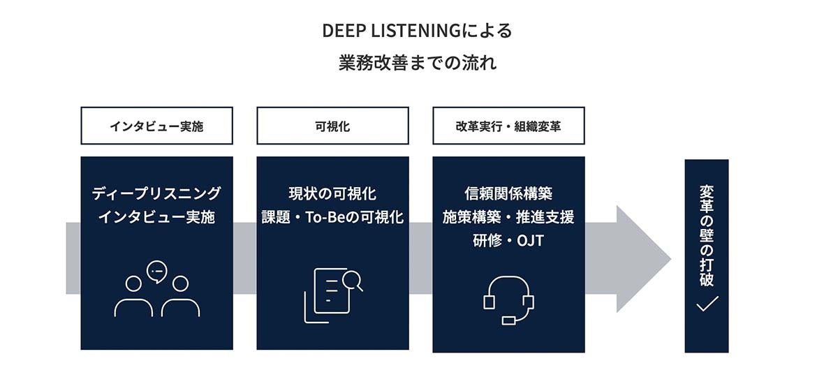 Deep Listeining+ Consulting の最大の強みは、正しく実態を把握することで業務と課題を可視化すること、および信頼関係構築により現場の抵抗など変革の壁を取り払えることです。