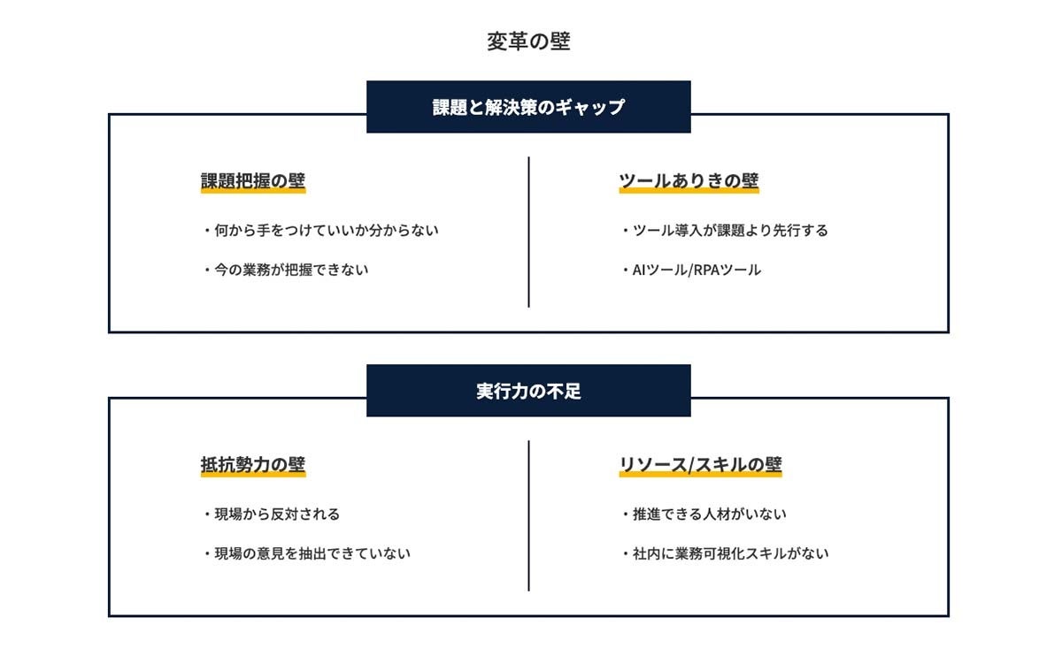 業務と課題の可視化は、業務の改善・変革における最初の一手として重要であるものの、やり切ることは難しいと言われます。