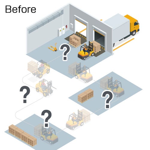 フォークリフトの実際の稼働状況などはリアルタイムな把握が難しく、効率よく指示することが困難でした。UHFフォークシステムを導入することで、フォークリフトの稼働状況・入出庫情報をリアルタイムに把握することができ、管理者が出荷状況を把握しながら効率的な配送管理を行うことができます。