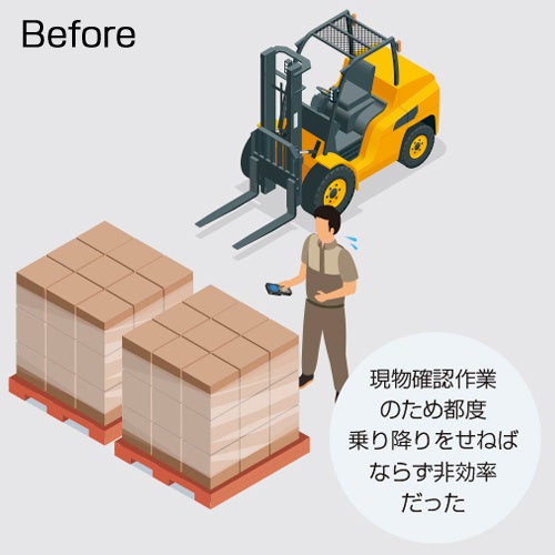 導入後は、車載端末からのピッキング情報を確認し、フォークリフトから、降りることなく作業を行えるようになります。また、パレットの取り違え防止効果もあります。