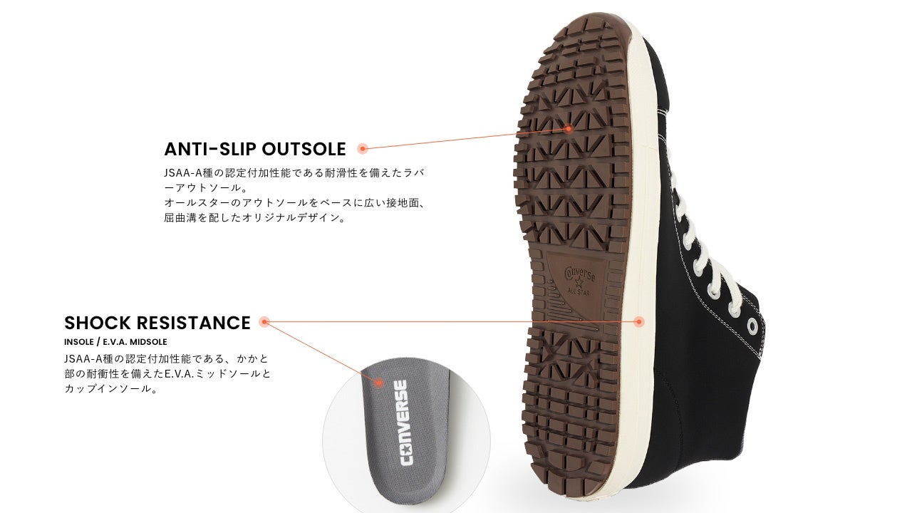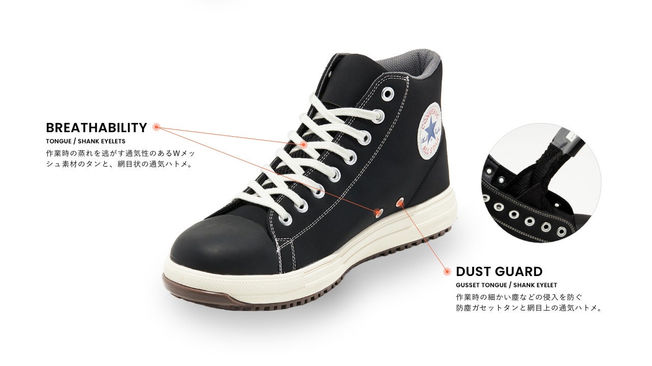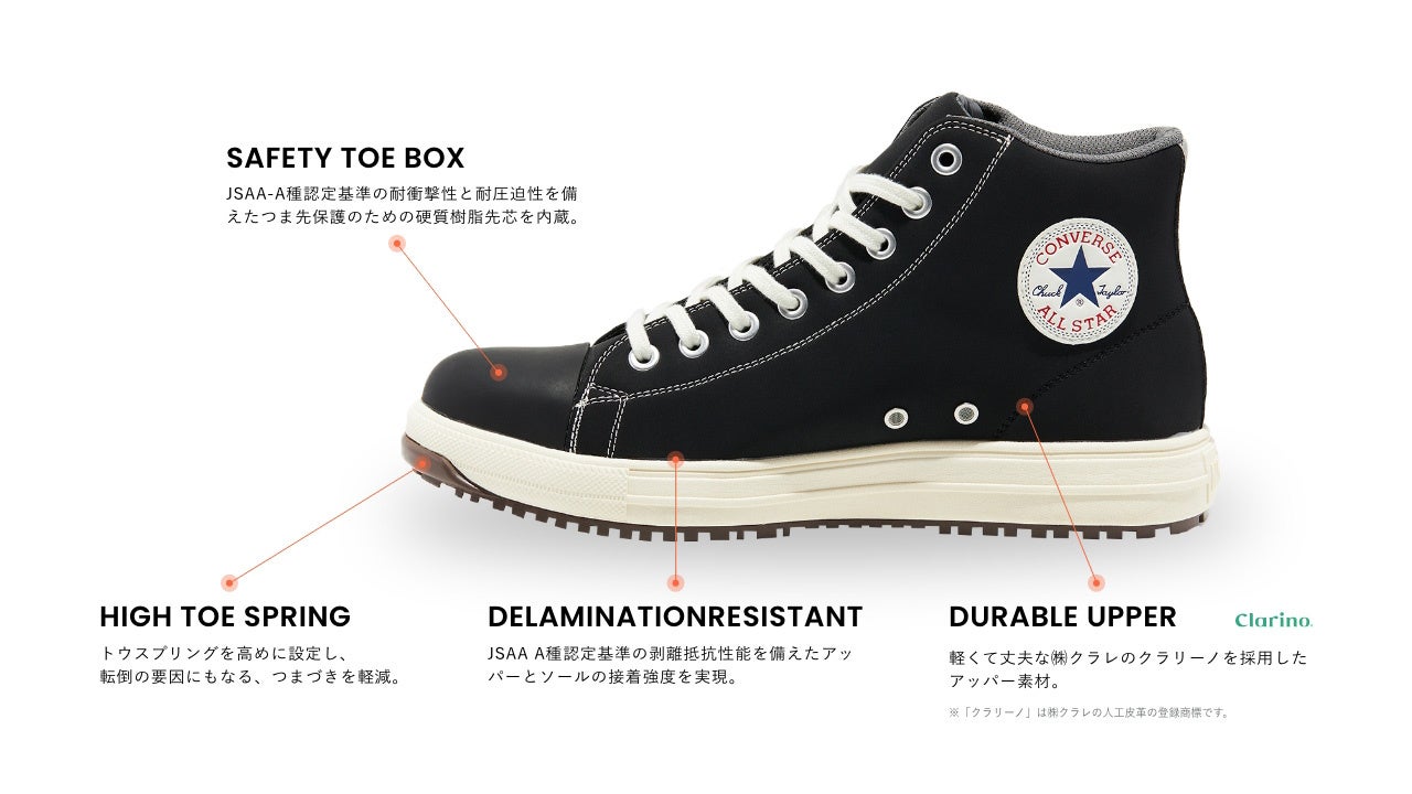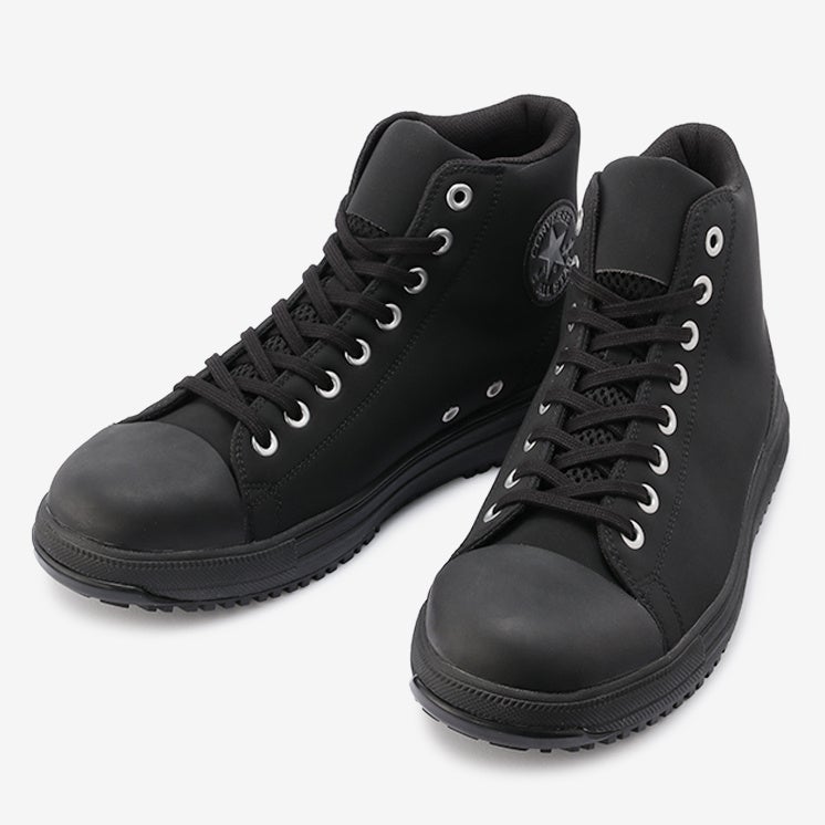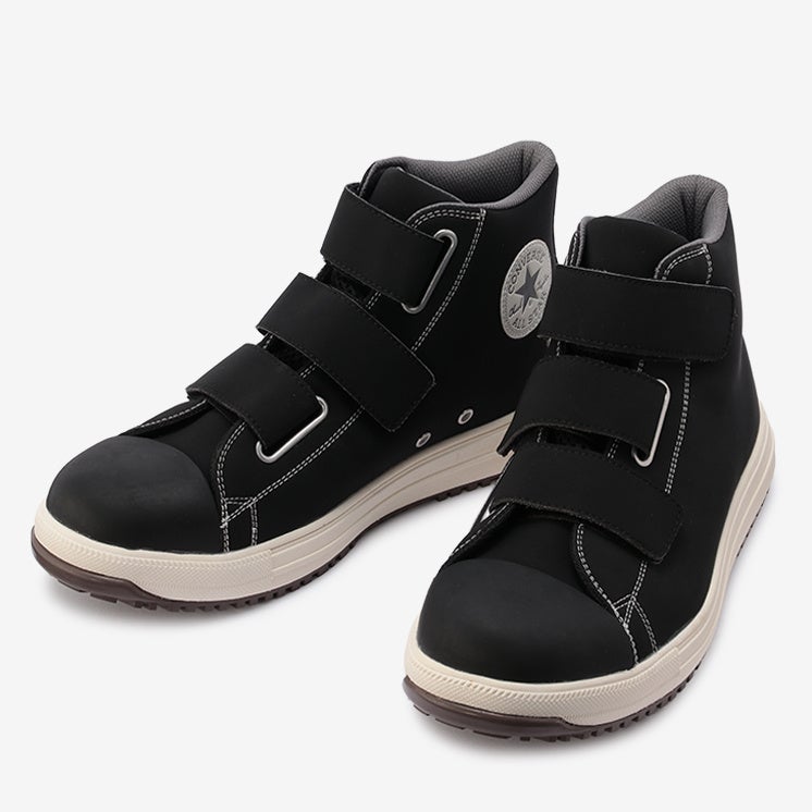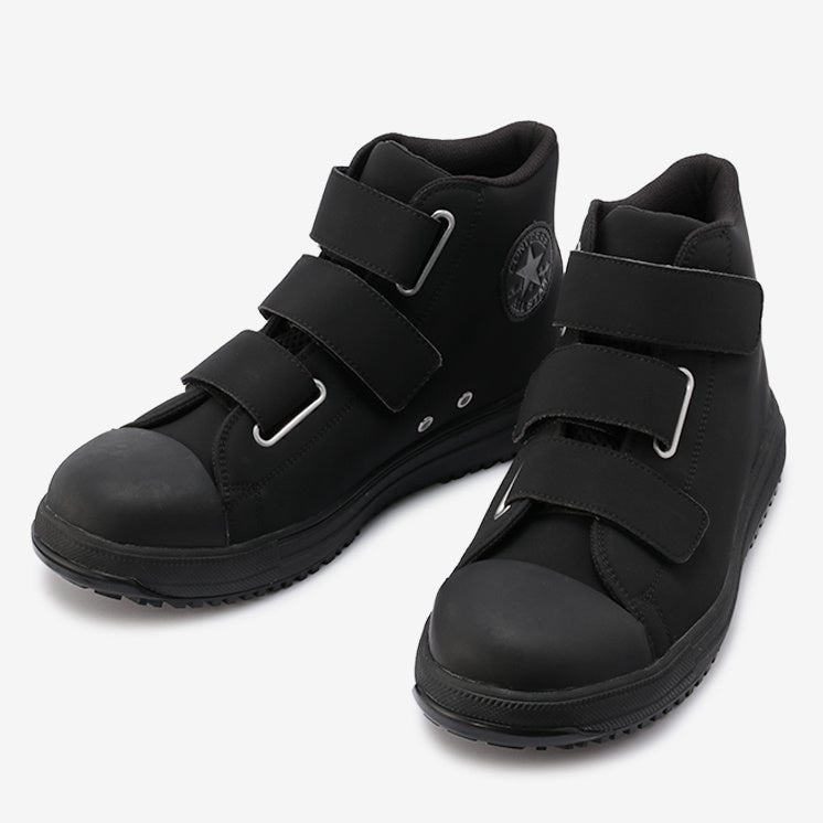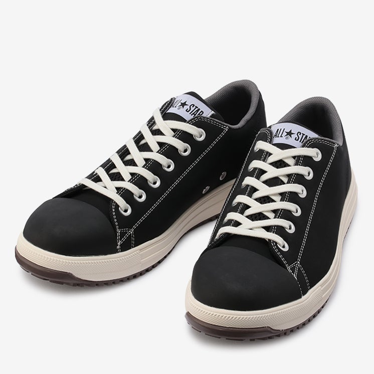 安全性や耐久性とコンバースならではのデザイン性を兼ね備えたオールスターデザインのプロテクティブスニーカー。アッパーには軽くて丈夫な「クラリーノ®」を採用し、つま先保護のための硬質樹脂先芯や耐滑性を備えたラバーアウトソール、衝撃吸収性を備えたミッドソールやカップインソールなどプロテクティブスニーカーとして必要なスペックを完備。リフレクターを配した踵紐で作業時の安全性を高めた。リフレクター織込みのシューレースも付属。作業時に付着する汚れなどを目立ちにくくしたカラー配色のブラックモノクローム、ブラックの2カラー展開。