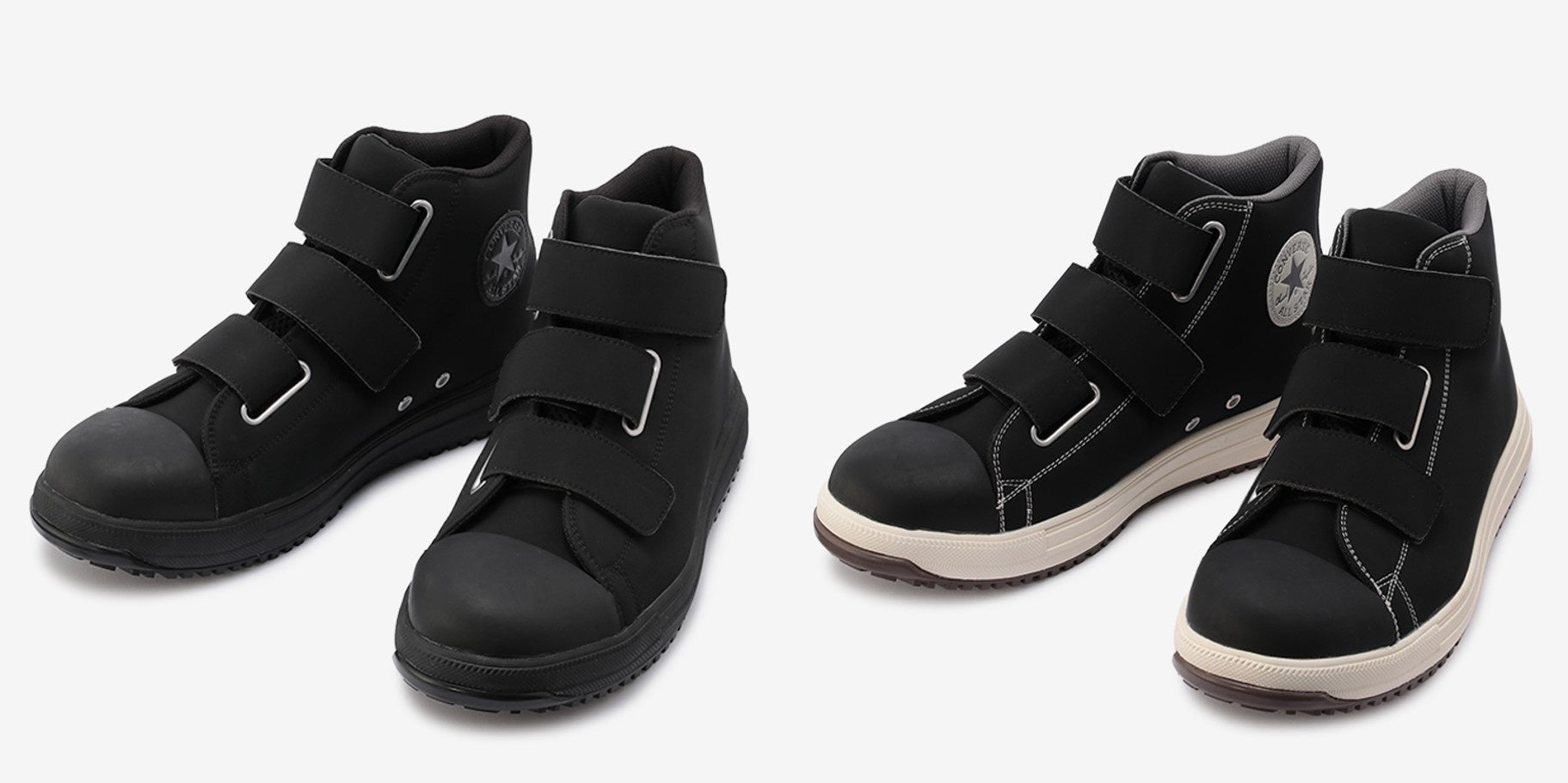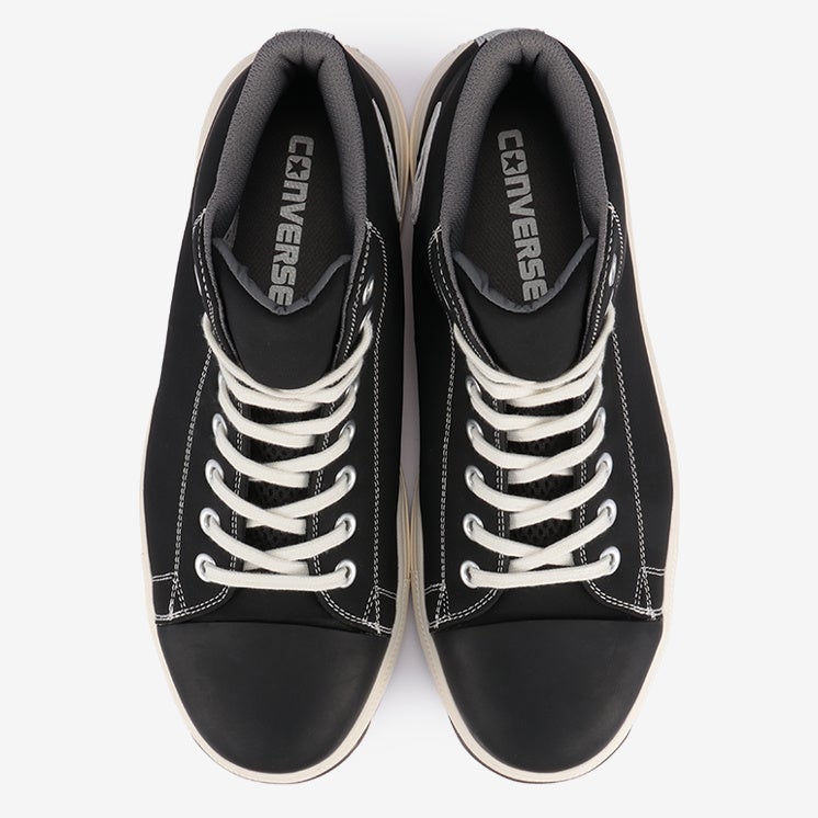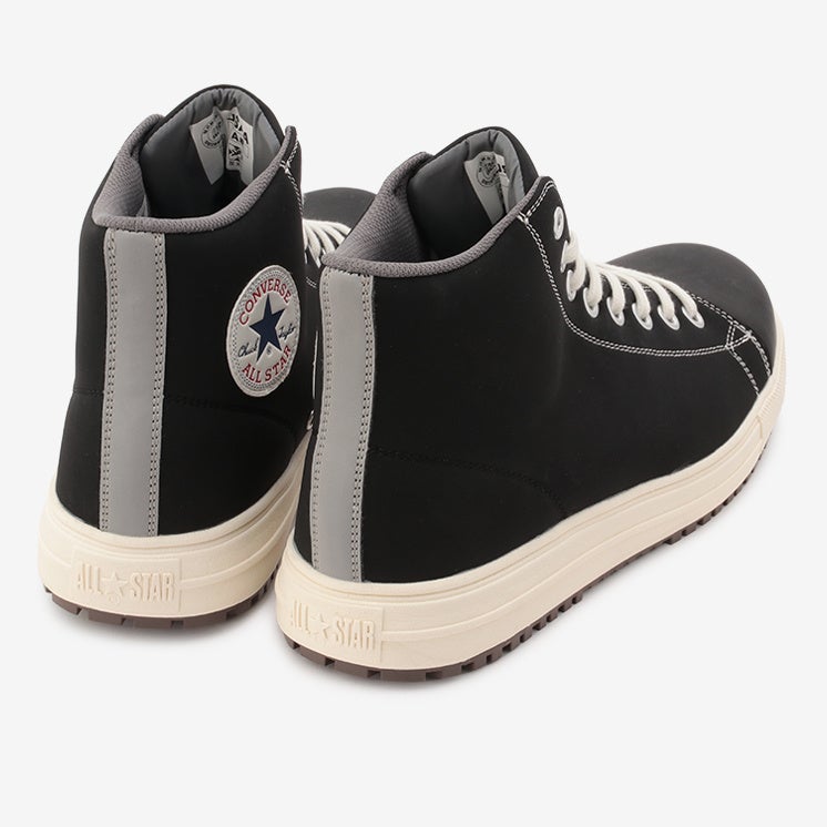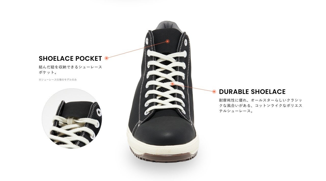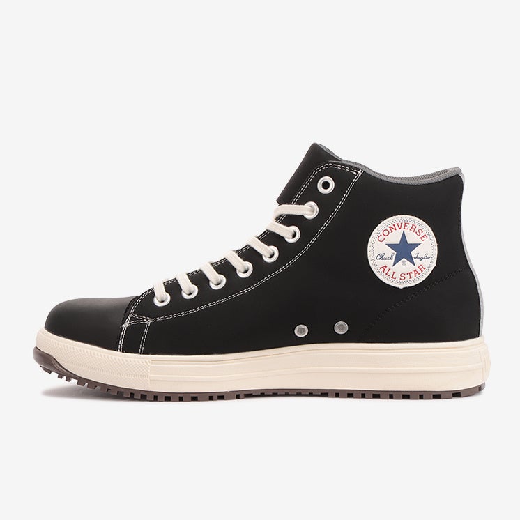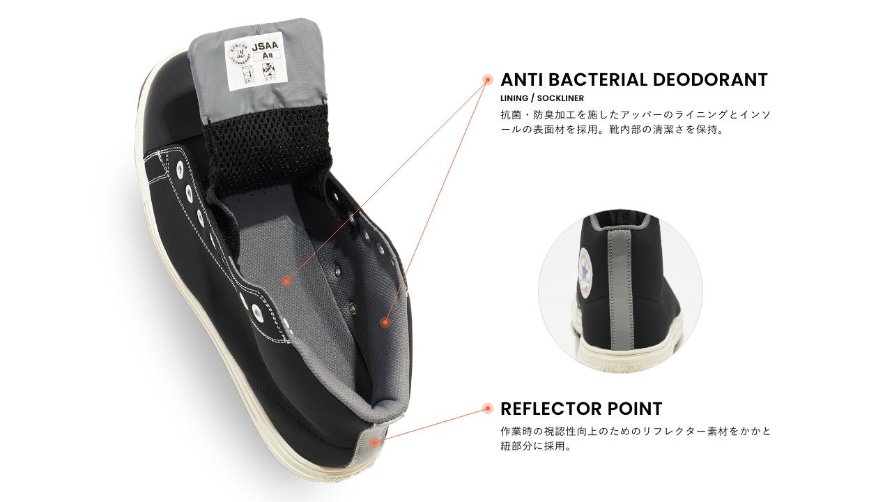 安全性や耐久性とコンバースならではのデザイン性を兼ね備えたオールスターデザインのプロテクティブスニーカー。アッパーには軽くて丈夫な「クラリーノ®」を採用し、つま先保護のための硬質樹脂先芯や耐滑性を備えたラバーアウトソール、衝撃吸収性を備えたミッドソールやカップインソールなどプロテクティブスニーカーとして必要なスペックを完備。リフレクターを配した踵紐で作業時の安全性を高めた。リフレクター織込みのシューレースも付属。作業時に付着する汚れなどを目立ちにくくしたカラー配色のブラックモノクローム、ブラックの2カラー展開。