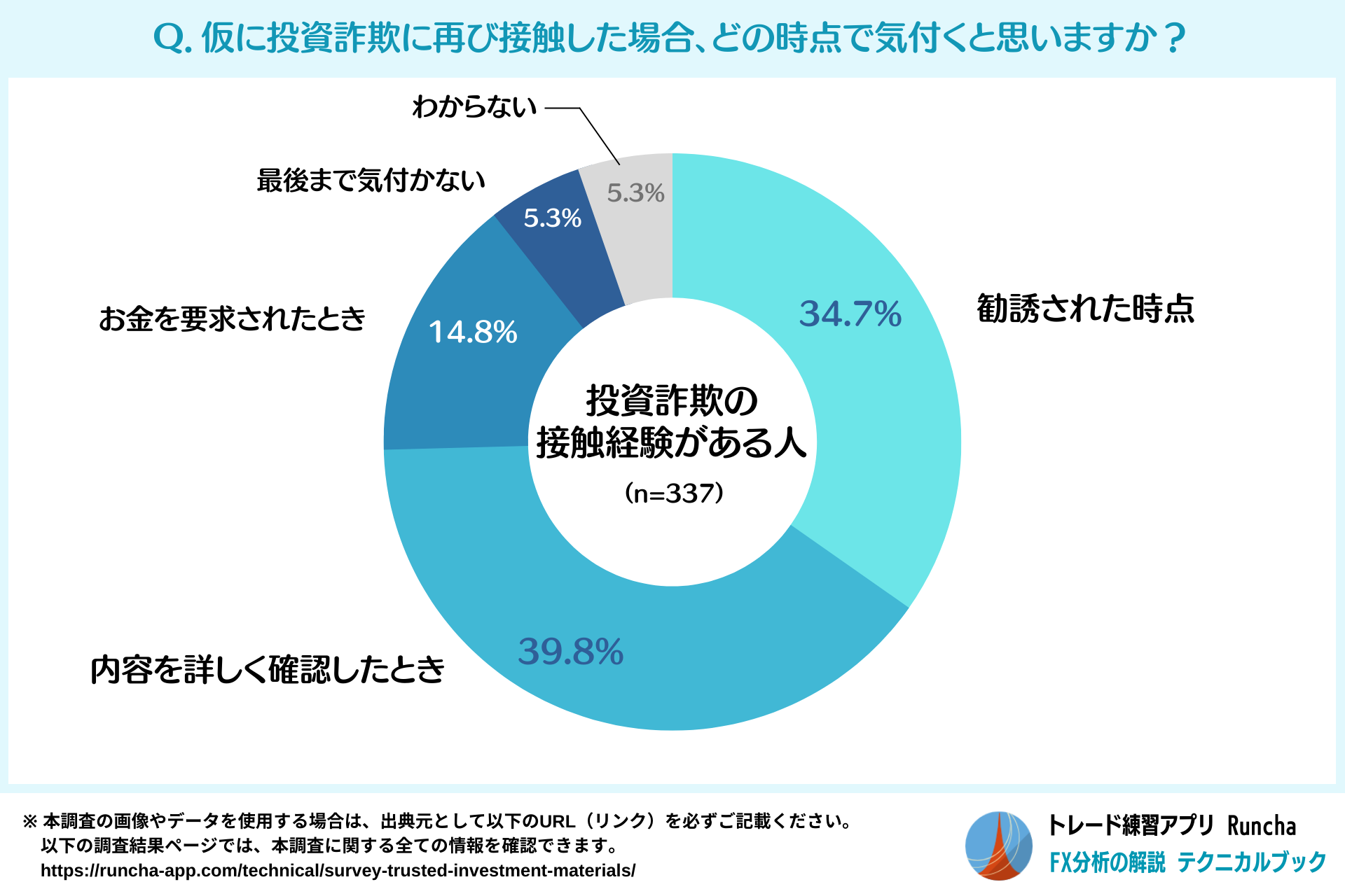 同様の投資詐欺に再び接触した際に詐欺と気付くタイミングについて質問したところ、「内容を詳しく確認したとき」が最も多く39.8%、これに「勧誘された時点」の34.7%、「お金を要求されたとき」の14.8%が続く形となりました。「最後まで気付かない」または「わからない」と回答した人はいずれも5.3%で、多くの人が詐欺に気付くことができると考えているようです。