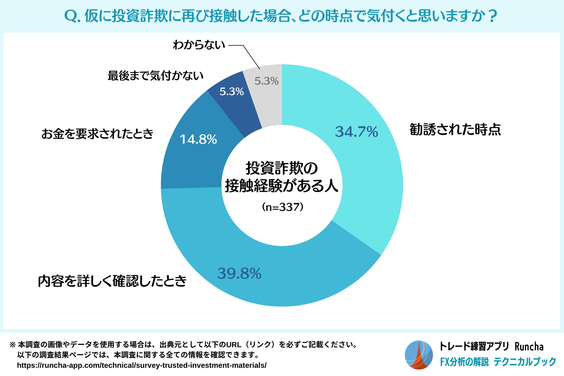 2.投資詐欺に気付くのは「内容を詳しく確認したとき」が39.8%、「勧誘された時点」が34.7%