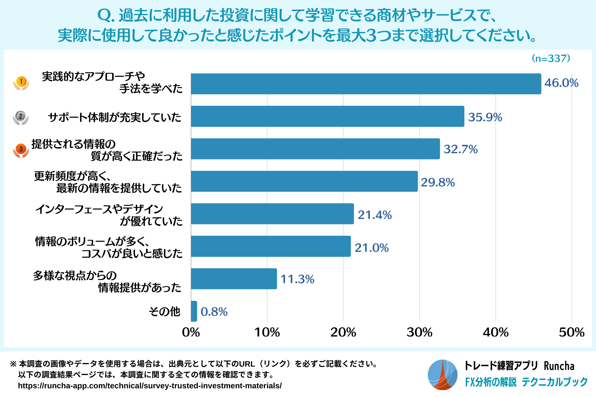・投資の学習教材等を利用者が評価するポイントは「実践的な情報/充実したサポート/質の高い情報」