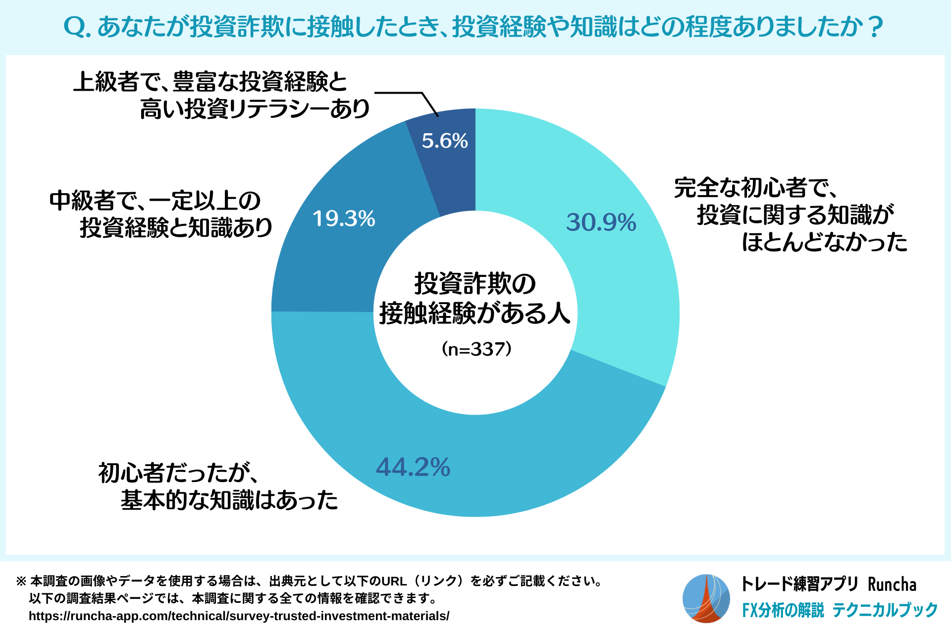 投資詐欺に接触したときの投資経験について質問したところ、最も多かったのが「初心者だったが、基本的な知識はあった」で44.2%、次に多かったのが「完全な初心者で、投資に関する知識がほとんどなかった」で30.9%でした。両者を合わせると75.1%で、投資詐欺に接触した人の大半が初心者であったことになります。