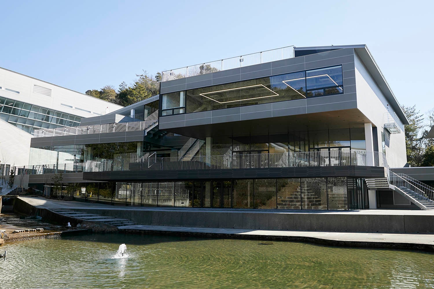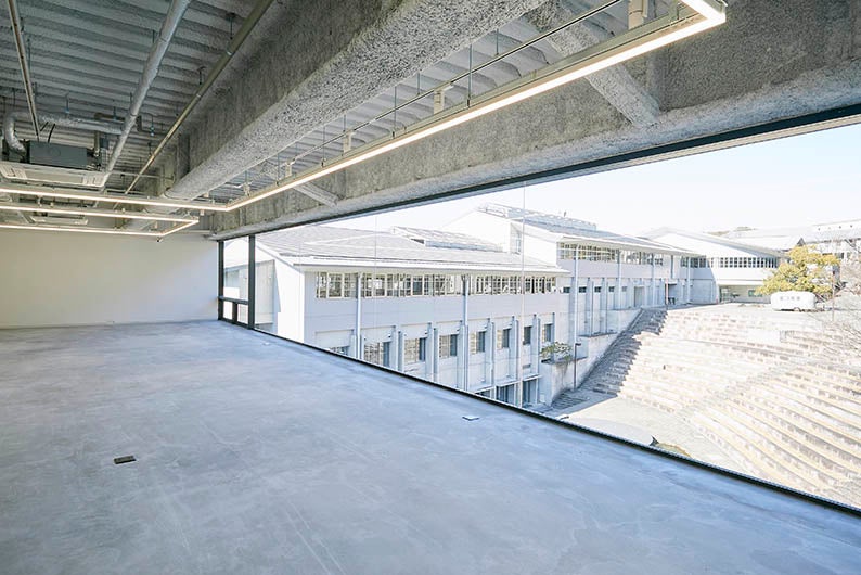池に向かって宙に突き出た「箱」が目印です。北西側の壁一面がガラス張りになっていて、キャンパス中央の広場を一望することができます。明窓館全体の開放的で明るいイメージも相まって、自由で開かれた創造の場を印象付けています。
