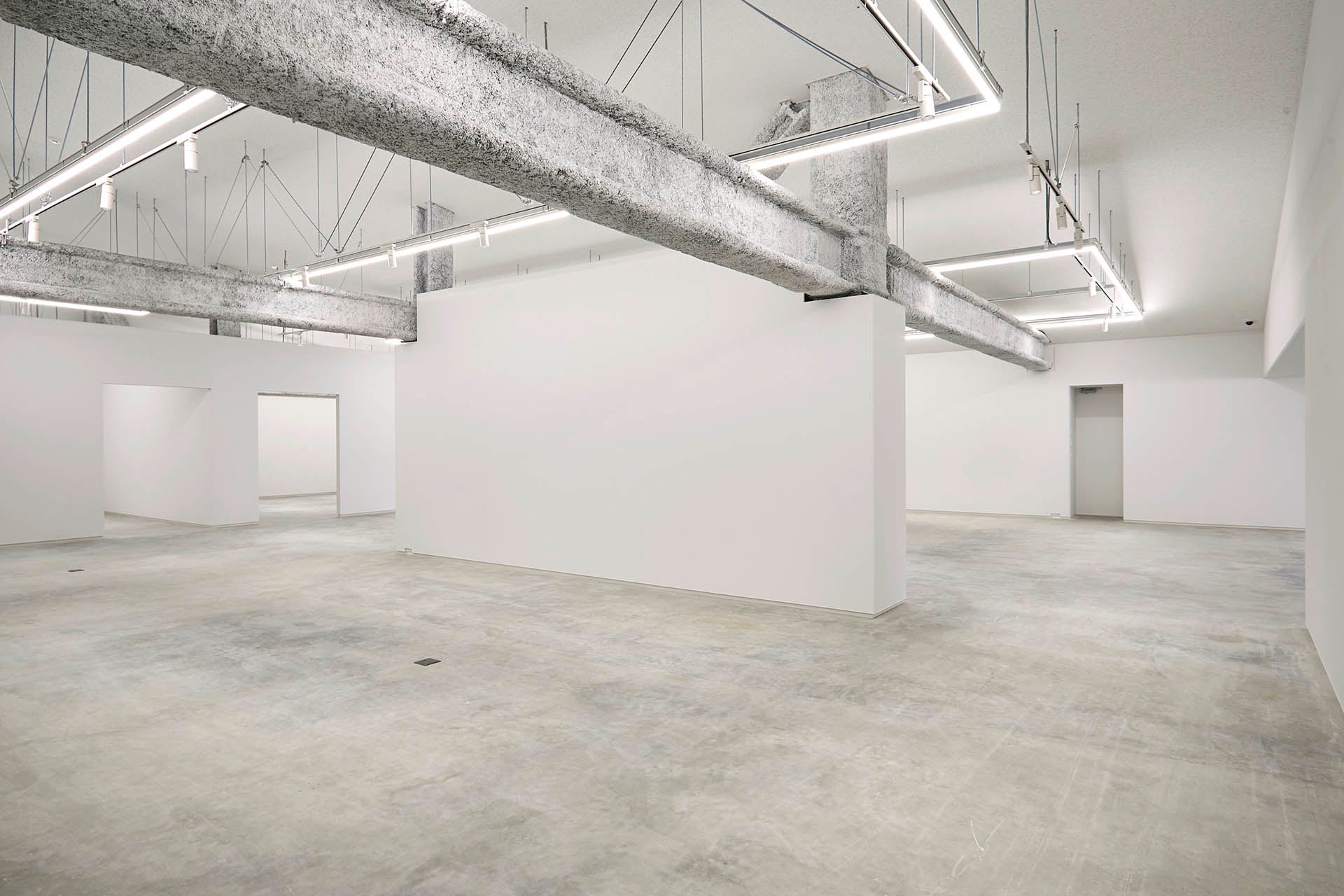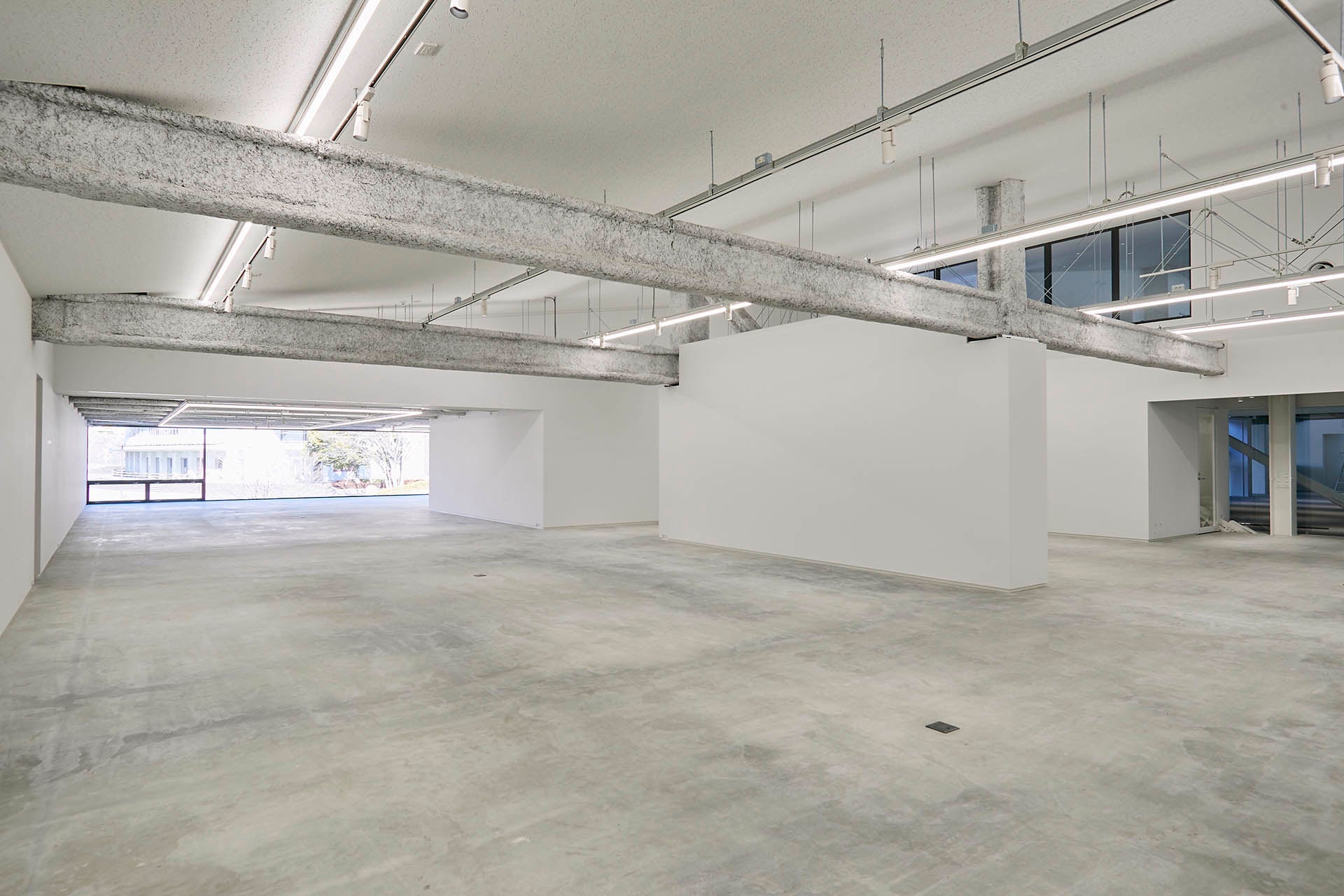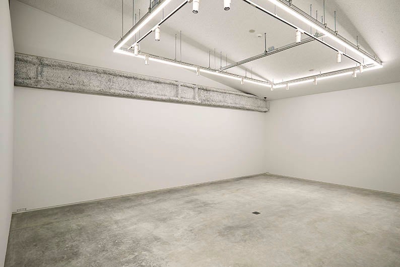 ギャラリーは、天井が高いエリアと低いエリアに分かれ、前者は、中・小二つの展示室と、中央に常設の展示壁が立つ広々とした展示空間を備えています。後者は、ガラス面を通して階下を見下ろす吹き抜けや、外の風景を取り込む巨大なガラス壁など、のびやかなで個性的な空間となっています。二つのエリアでの異なる展覧会の同時開催や、全区域あるいは半分だけ用いた展覧会の開催など、目的や内容に応じて使い分けることが可能です。