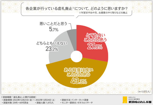 株式会社新潟味のれん本舗(本社所在地:新潟県長岡市、代表取締役:渡邊 幸雄)は、20代~60代男女を対象に、「虚礼廃止」に関する調査を実施しました。