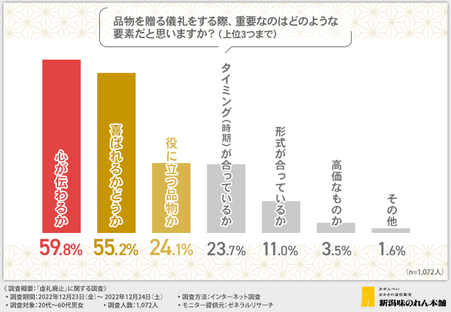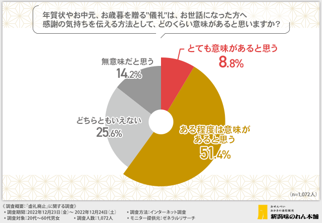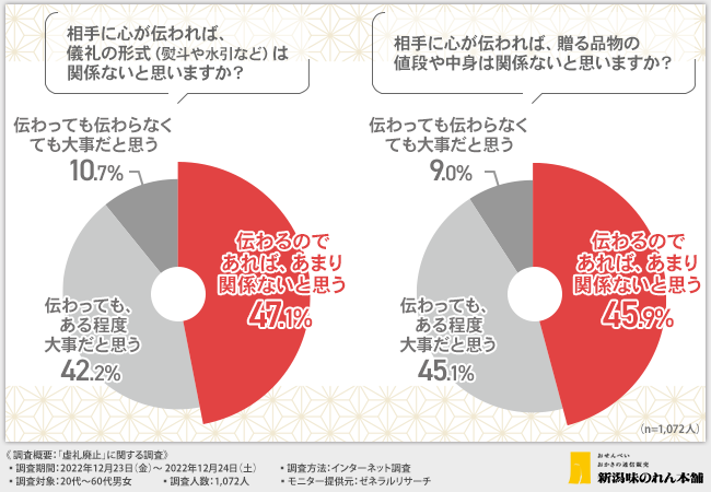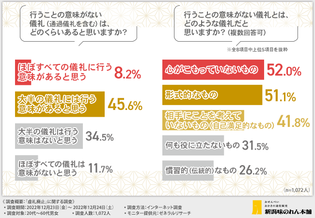そこで今回、新潟の工場直送・国産米100%のおせんべい・おかきのメーカー株式会社新潟味のれん本舗(https://www.ajinoren.co.jp/)は、20代~60代男女を対象に、「虚礼廃止」に関する調査を実施しました。