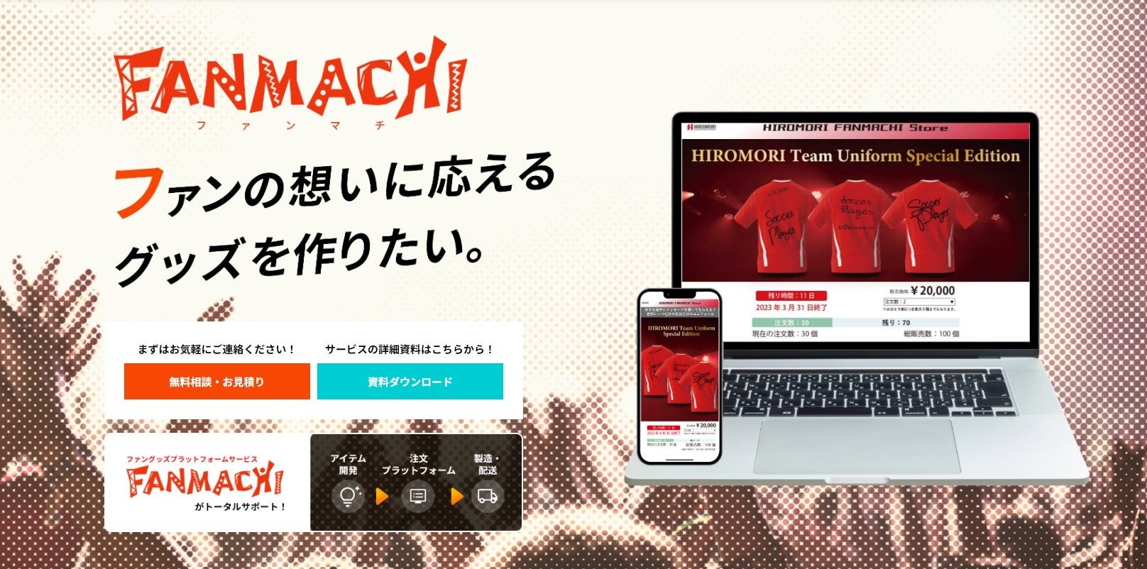 「FANMACHI」とは、オーダーが予定数量に達したら実現する非在庫型プレミアグッズ販売サービスです。売れ残り、在庫のリスクゼロで展開できるため、これまでのマンネリ化したグッズから脱し、企業・ブランド・チームの独自性と差別性の高いオリジナルグッズを製作・販売することが可能です。グッズの開発、オーダー受付、製造、決済、配送まで一気通貫でご提供できるので、ご担当者の負担を軽減し、売り上げ利益にも貢献します。
