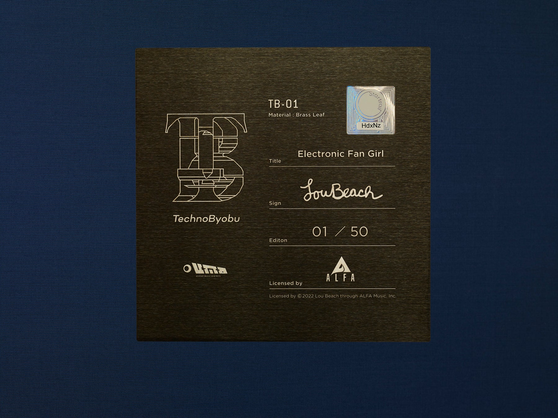 第一弾となる「Electronic Fan Girl」は、アーティストのルー・ビーチ氏が、YMO世界デビュー時のワールドワイド版ファースト・アルバム「Yellow Magic Orchestra」のジャケットとして作成した有名なアートワークを、118年の歴史を持つ歴清社の技術により洋金箔(真鍮箔)の上に施したNFT証明書付き作品です。