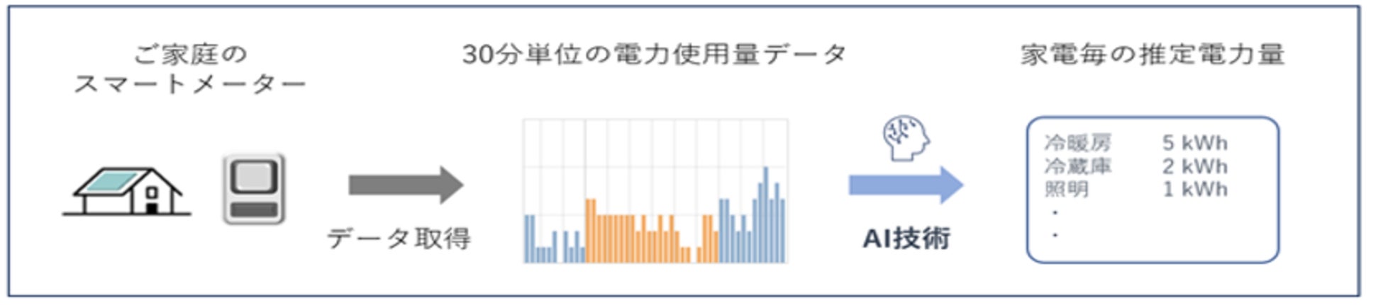 トドでんAIは、当社がもつ最先端かつ独自のAI技術を用いて資本業務提携先である伊藤忠エネクスと、コープさっぽろ向けに共同で開発したものであり、ご使用されている家電機器別の電力使用状況を見える化するサービスです。各ご家庭に設置されているスマートメーターから得られる30分単位の電力使用量データを、AI技術を用いて5種類(冷暖房、冷蔵庫、待機電力、照明、その他機器)のカテゴリーに分離し、1日毎に、機器別の電力使用量を推定することにより、ご家庭内の電力使用状況を分かりやすく把握できるようにします。