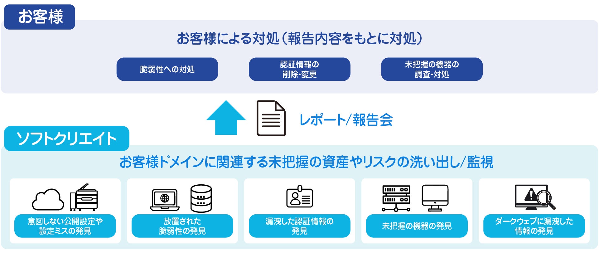 ASMツールの運用はソフトクリエイトが行います。継続的な監視により、新たな脅威にも攻撃発生前に対処が可能で、緊急対応を要する脅威を検出した場合はメールにて速報を送付します。また定期的な報告会にて脅威動向の変化と真に対応すべき箇所のアドバイスを行います。メールでの問い合わせにも対応可能です。