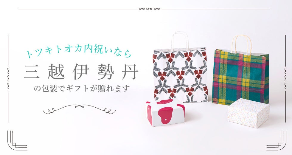 三越伊勢丹とのコラボレーションで、さまざまな世代の方に喜んでいただける上質な贈り物を多数取り揃えております。お贈りの際には、三越伊勢丹の包装紙、手提げ袋をお選びいただくことができます(※一部商品を除く)。