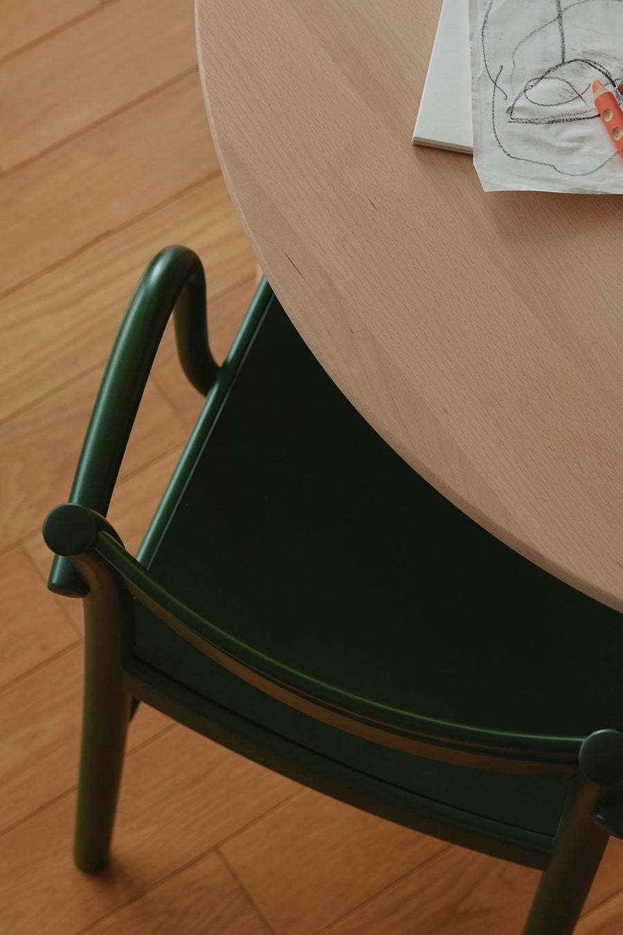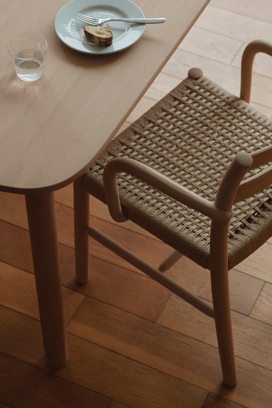 シンプルながらも愛らしいデザインが特徴のチェア。ブナ材ならではの曲げやすさを生かしたアームは、思わず触れたくなるような優しいフォルムです。背もたれのわずかな丸みが、座る際や移動させる際の手に心地よい温もりと安らぎをもたらします。さらに、シートは張り込み、板座、ペーパーコードの3種類をご用意。多様な生活環境にフィットする選択肢が魅力です。