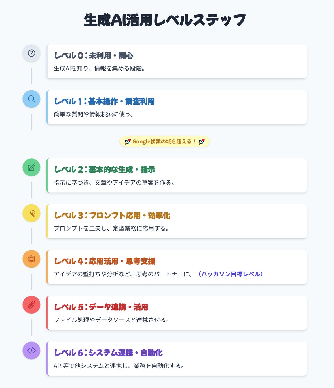 本ハッカソンでは、部門を越えた実践を通じて、全スタッフがレベル4「応用活用・思考支援」への到達を目指しました。