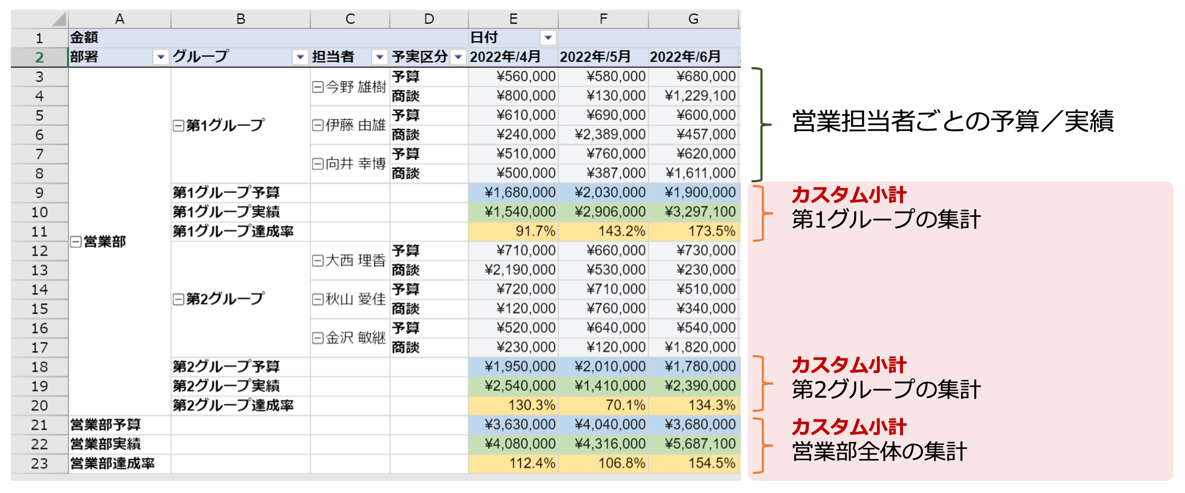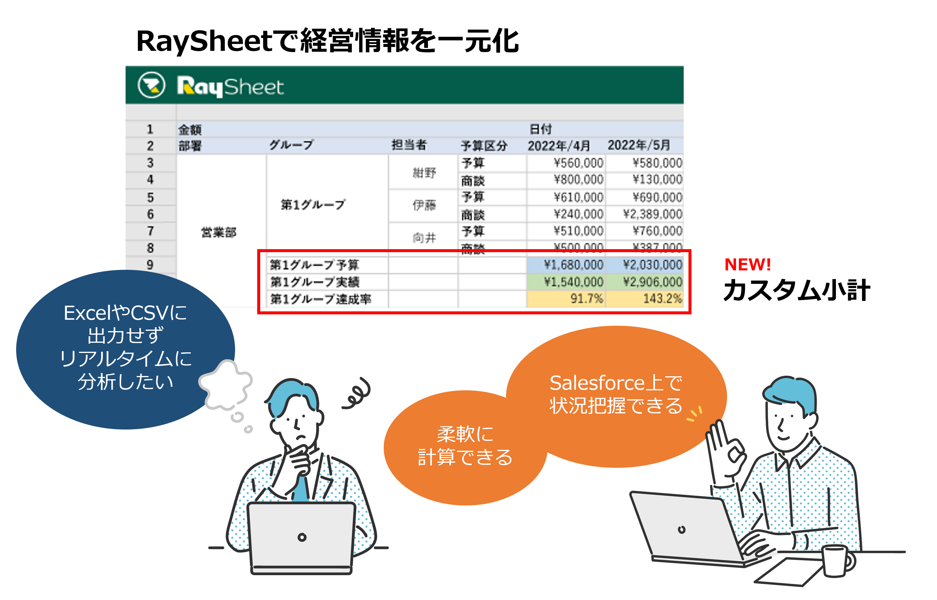 今回のアップデートでは、RaySheetPivotに「カスタム小計」という機能を追加しました。カスタム小計は、クロス集計の集計結果に対して独自の計算式を設定し、一覧上の任意の行や列に挿入できる機能です。商談と受注といった異なるオブジェクトも集計対象にできるため、CSVに出力してからExcelで加工するといった手間をなくし、自由な切り口の分析をリアルタイムで行えるようになります。例えば、予算から販売管理費の小計を算出したり、受注データから営業利益をリアルタイムで確認する、あるいは取引先ごと、事業部ごとの予算と実績の差異や達成率をひと目で把握するといったことが可能になります。