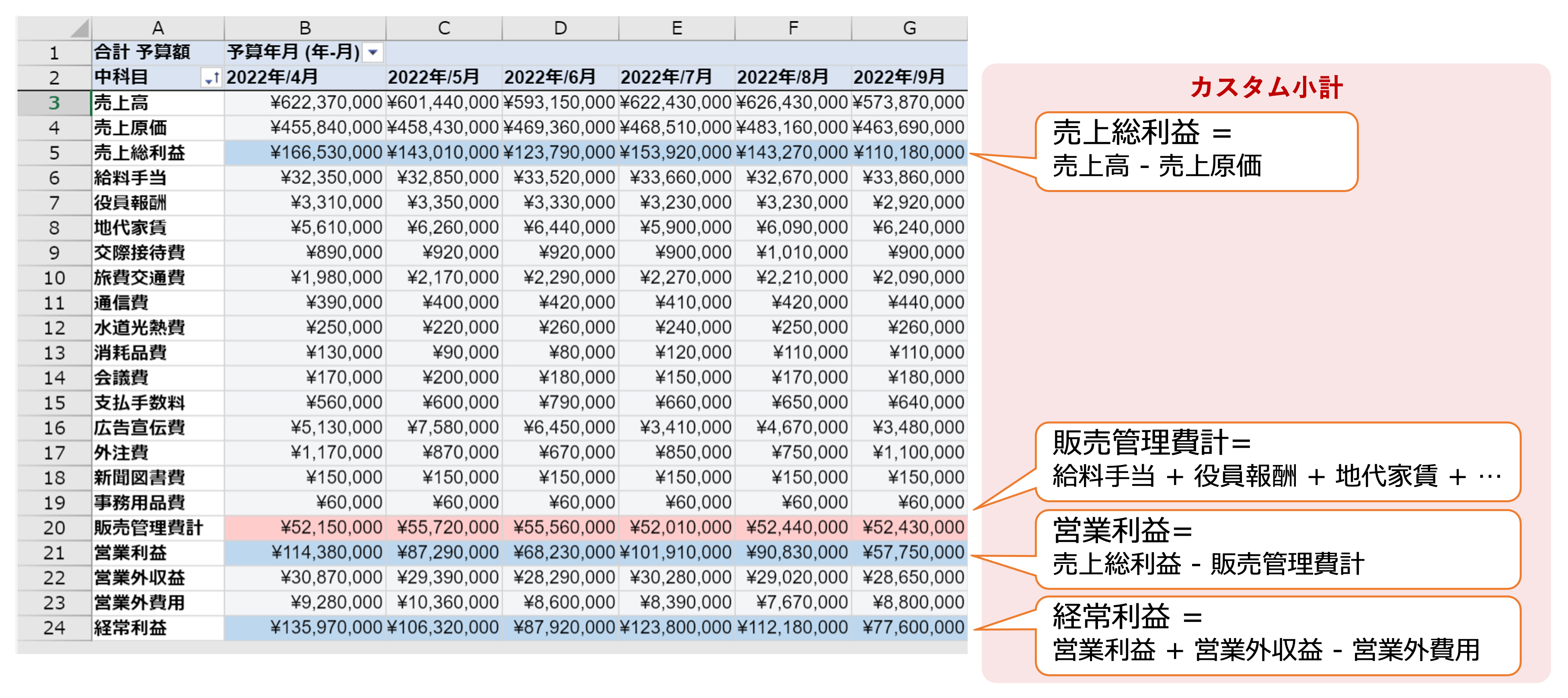 予算データを損益計算書のように月別で表示する例。利益と経費のバランスを科目ごとに検討しながら予算の策定が可能。
