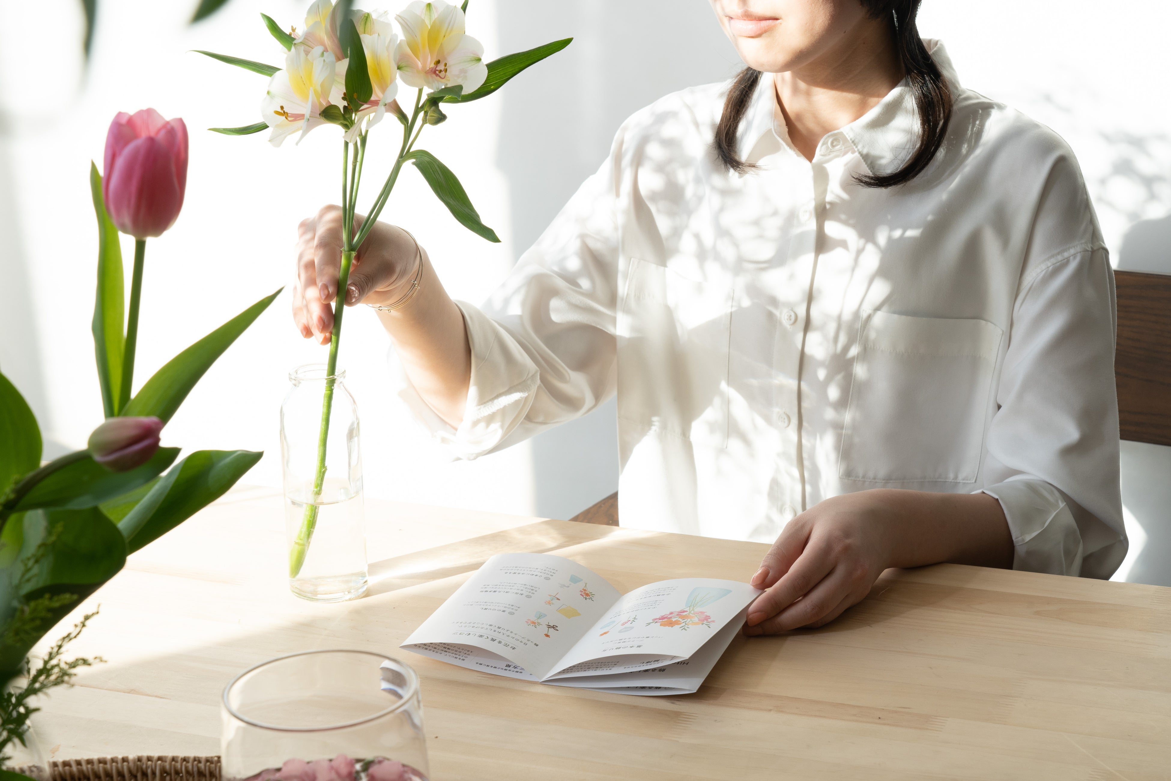 同梱されているブックレットには、お花が届いたら最初に行うことが記載されていたり、ご自宅の雰囲気に合わせた様々な飾り方をお選びいただけるような内容になっています。初心者の方でも簡単にお花を楽しめるコンテンツを、かわいいイラストつきでお届けします。