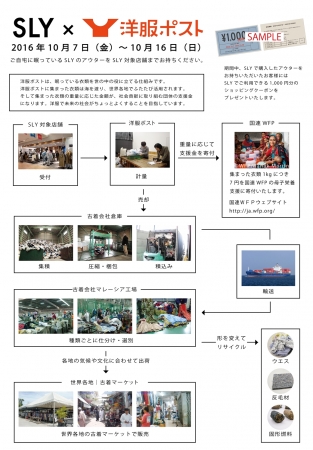 ご自宅に眠っている、SLYで購入したアウターを受付期間中に対象の全国8店舗にお持ちいただくと、そのアウターが世界各地でふたたび活用されます。アウター1kgにつき7円を国連WFPの母子栄養支援に寄付し、その活動を支援する活動をおこないます。アウターをお持ちいただいたお客様には、SLYでご利用できる1,000円分のショッピングクーポンをプレゼントいたします。(ショッピングクーポンは1回のお持込みにつき1枚お渡しいたします。)