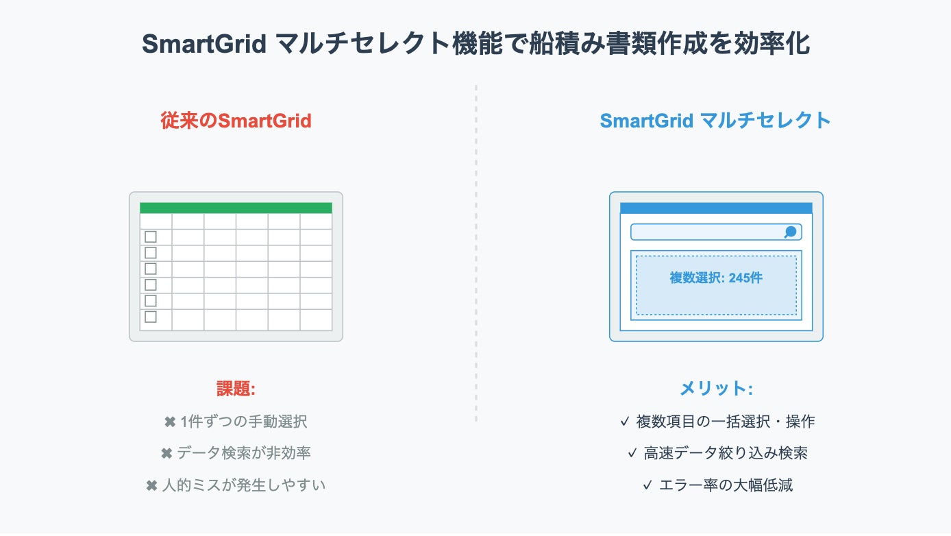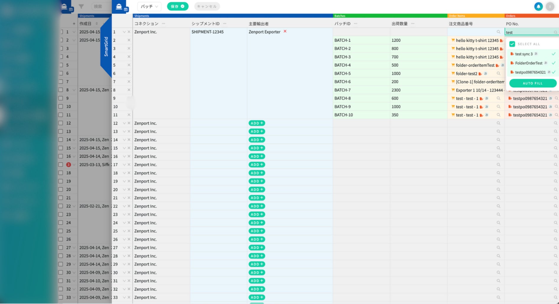 「SmartGrid」は「ZenGrid」上で動作するデータ一括入力画面であり、ZENPORTに連携されたデータを活用して船積書類のデータ転記を効率化する機能です。多数の船積み情報の登録における処理速度と使いやすさで、エクセルを超える業務体験を提供します。