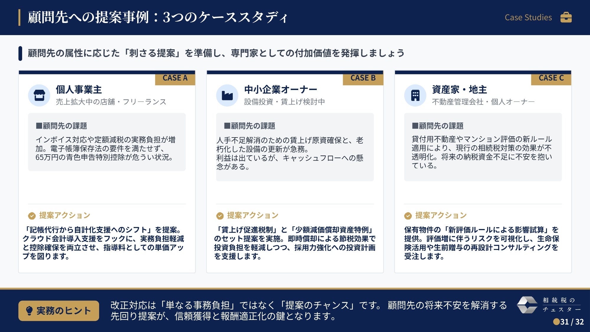 顧問先の属性に応じたコンサルティングの秘訣を伝授します。