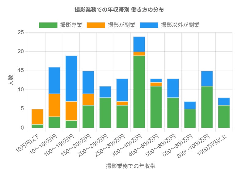 撮影を本業としているフォトグラファーの多くが、年収300万〜600万円の安定収入を実現していることが分かりました。