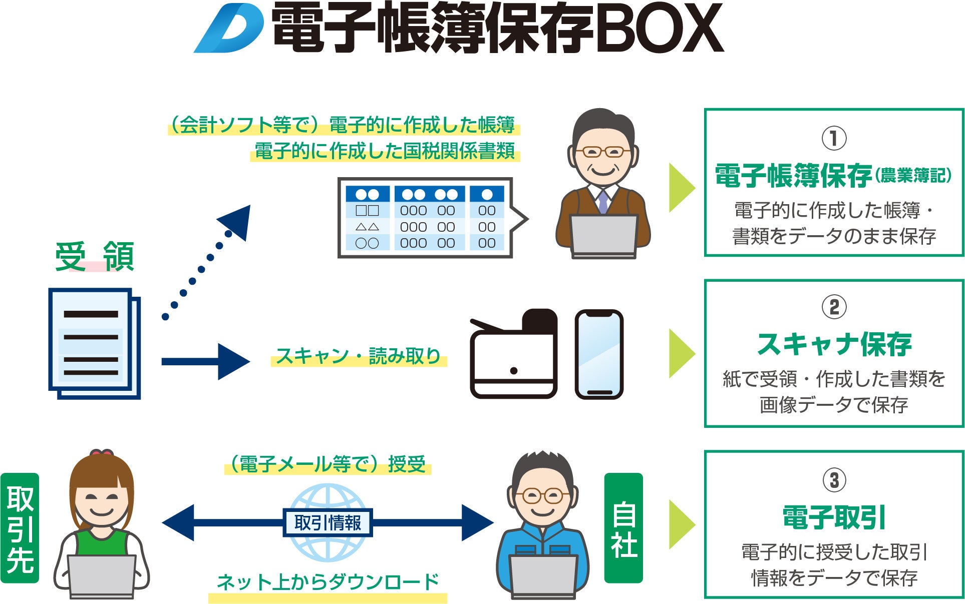 さらに農業簿記12ユーザー様(ソリマチクラブ会員様)なら無料でお使い頂けるアプリ、「電子帳簿保存BOX」 と連携させれば3つの要件全てに対応します。