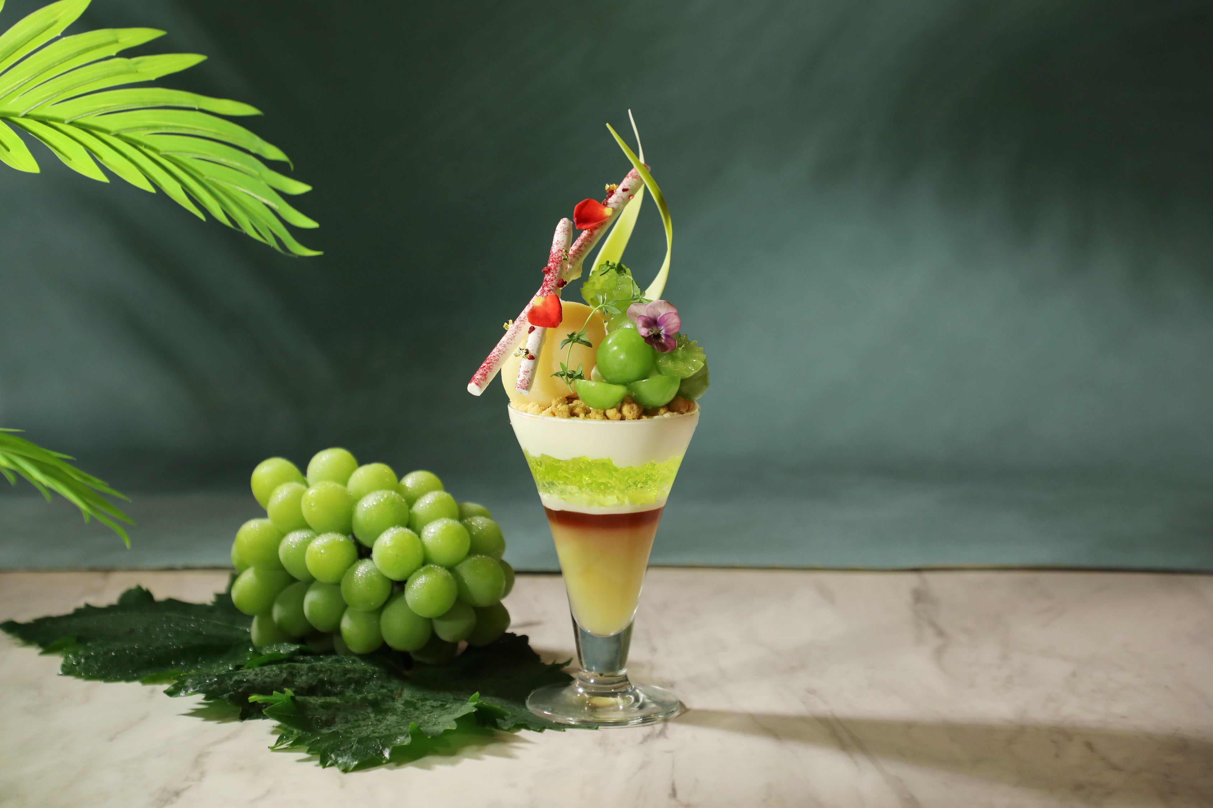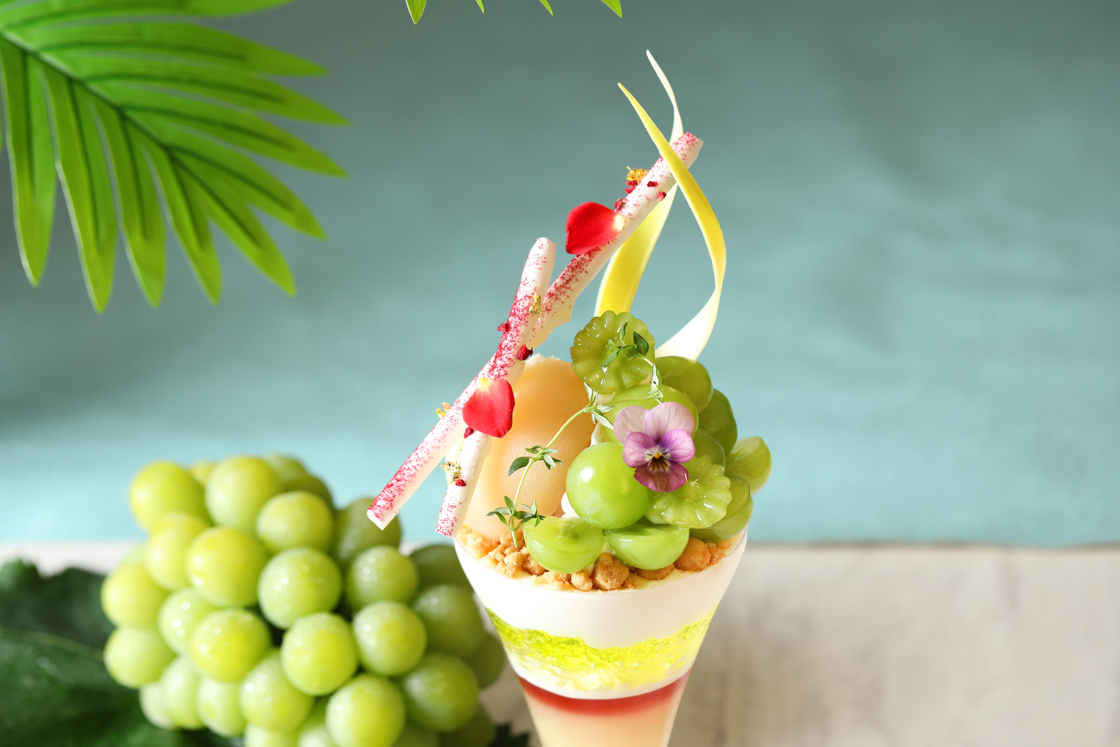 太陽をたっぷり浴びた船穂町産マスカット・オブ・アレキサンドリアをふんだんに使用し、食べるたびに芳醇な香りと爽やかな果汁が弾けます。総社産白桃のとろける果肉、華やかなムラング、繊細なチョコレート細工を重ね、見た目にも華やかな“カラフルで立体的な夏パフェ”に仕上げました。
