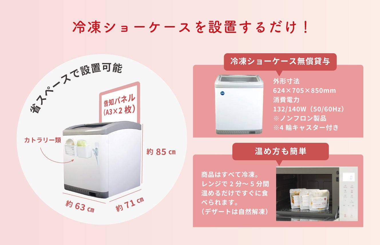 「mognowa +(モグノワプラス)」は、主菜、副菜、スープ、デザートの4つのカテゴリーの冷凍食品を専用ショーケースに設置し提供するプチ社食サービスです。