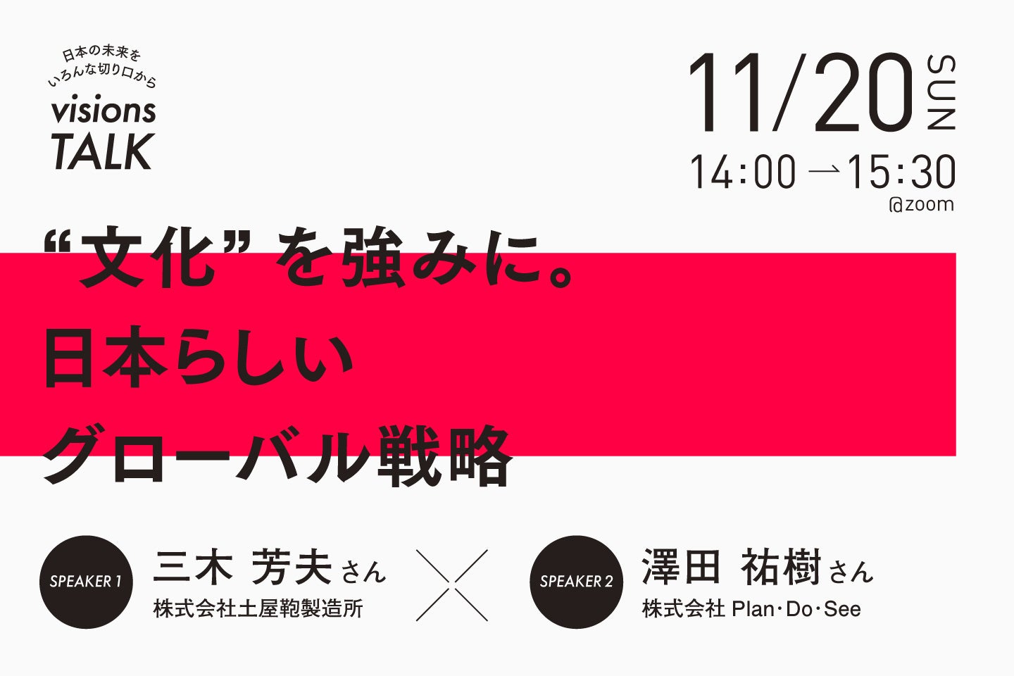 株式会社 パラドックス(本社:東京都港区、代表取締役 鈴木 猛之)が運営する、こころざしで未来をつくるブランディング・プラットフォーム「visions」主催のミートアップを2022年11月20日(日)にオンライン開催いたします。記念すべき第一回目のゲストには、株式会社 土屋鞄製造所(本社:東京都足立区、代表取締役 土屋 成範)と株式会社 Plan・Do・See(本社:東京都千代田区、代表取締役 野田 豊)の2社をお迎えし「みんなで日本の未来を考える」場として、“これからの日本らしいグローバル戦略“をテーマにお話をお伺いします。