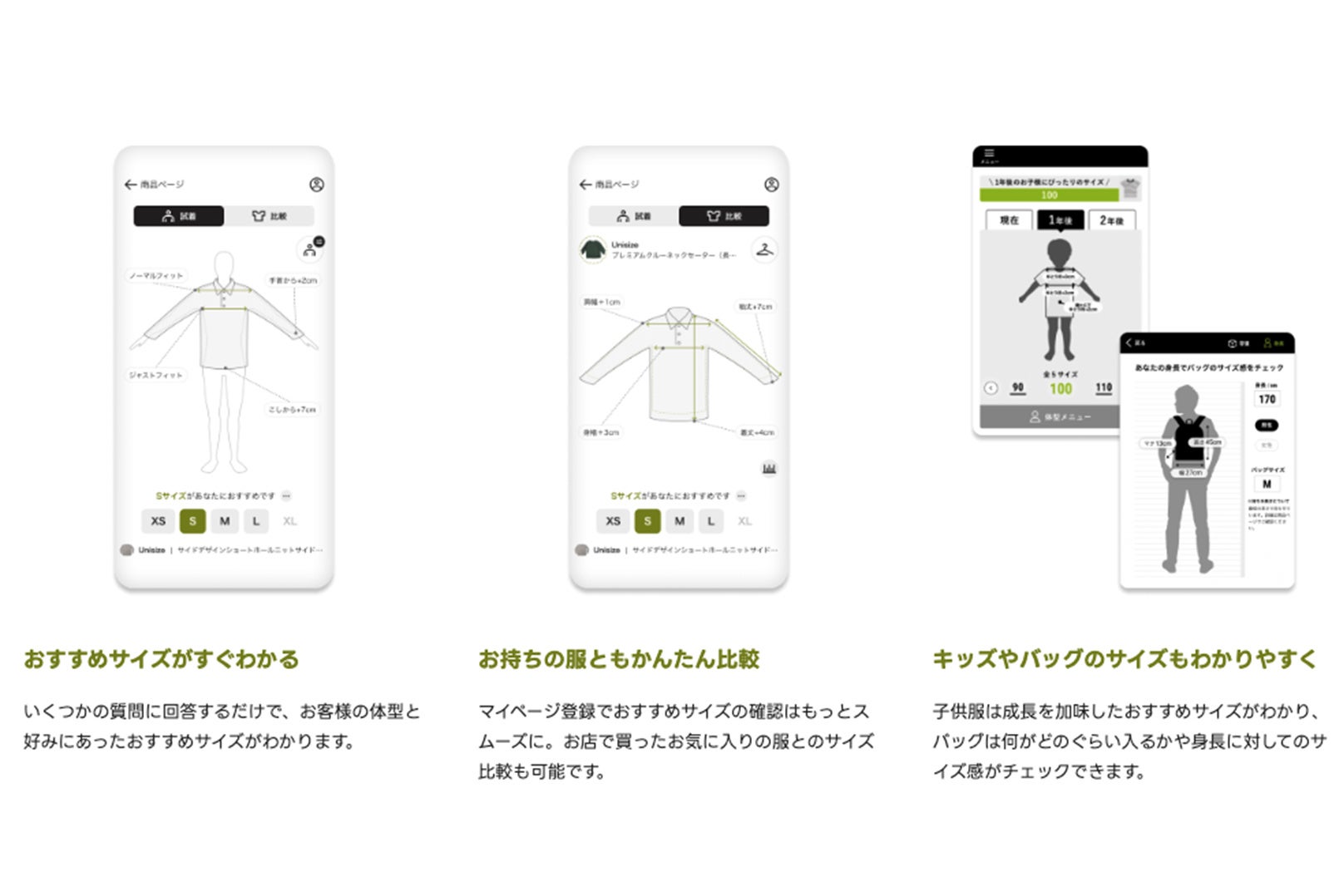 unisizeはネットで洋服(子供服含む)やバッグなどを買うときに、より身体に合ったサイズを推奨するサイズレコメンドエンジンです。国内外の洋服ブランドを対象とした多量な洋服・グッズのサイズデータを有し、入力されたユーザーの身体情報、特徴を元に最適なサイズを推定する独自のアルゴリズムでレコメンドを行っております。(※特許取得済み)