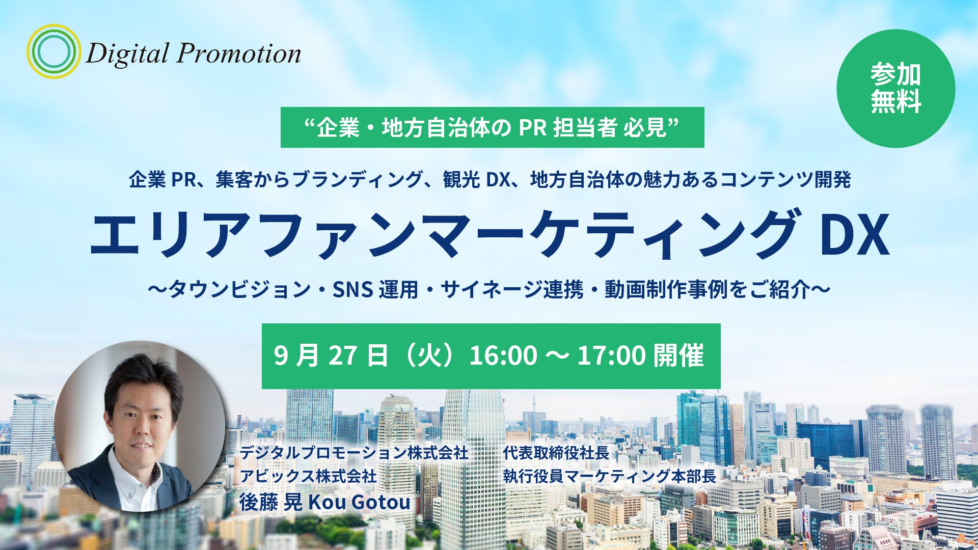 アビックス株式会社(本社:神奈川県横浜市 代表取締役社長:廣田 武仁)は、1989年にデジタルサイネージの提供から始まり、現在では、デジタルサイネージを中心とした、地域メディアとSNS、デジタルサイネージを連動させた販促・広告・マーケティングシステムの運営事業を行っております。この度、アビックスのグループ会社であるデジタルプロモーション株式会社の代表取締役社長の後藤が登壇し、「エリアファンマーケティングDX」について、企業PR、集客からブランディング、観光DX、地方自治体の魅力あるコンテンツ開発事例をまとめたセミナーを開催いたします。