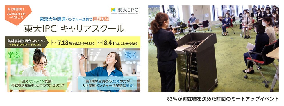 仕事に直結する学び直し(リスキリング)を支援する「キャリアシフトプラットフォーム」を通じて、すべての人の自分らしい人生を応援する人材サービス企業株式会社Waris(本社:東京都千代田区、代表取締役:米倉史夏、田中美和、河 京子、以下「Waris」)と、東京大学関連企業への投資や起業支援を行う東京大学協創プラットフォーム開発株式会社(本社:東京都文京区本郷、代表取締役社長 大泉克彦、以下「東大IPC」)は、スタートアップ企業のバックオフィス業務に役立つ実践的な講座とキャリアカウンセリングが一体となった再就職支援プログラム「東大IPC キャリアスクール」の第2期を2022年8月~10月に開催することを決定し、本日より募集を開始いたします。