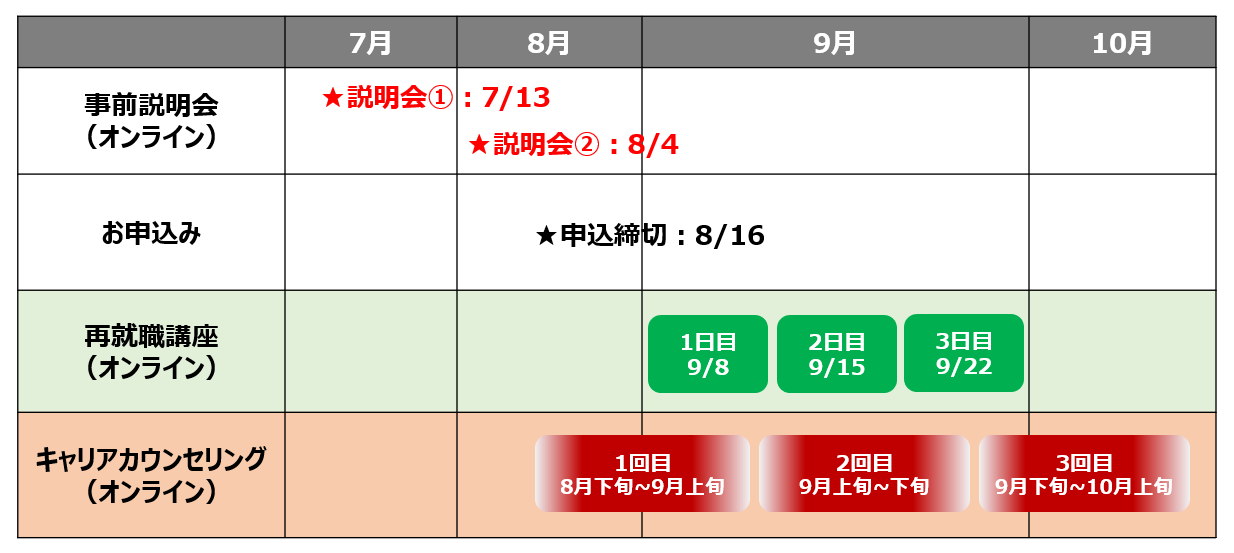 会場:オンライン(講座:3日/キャリアカウンセリング:3回)