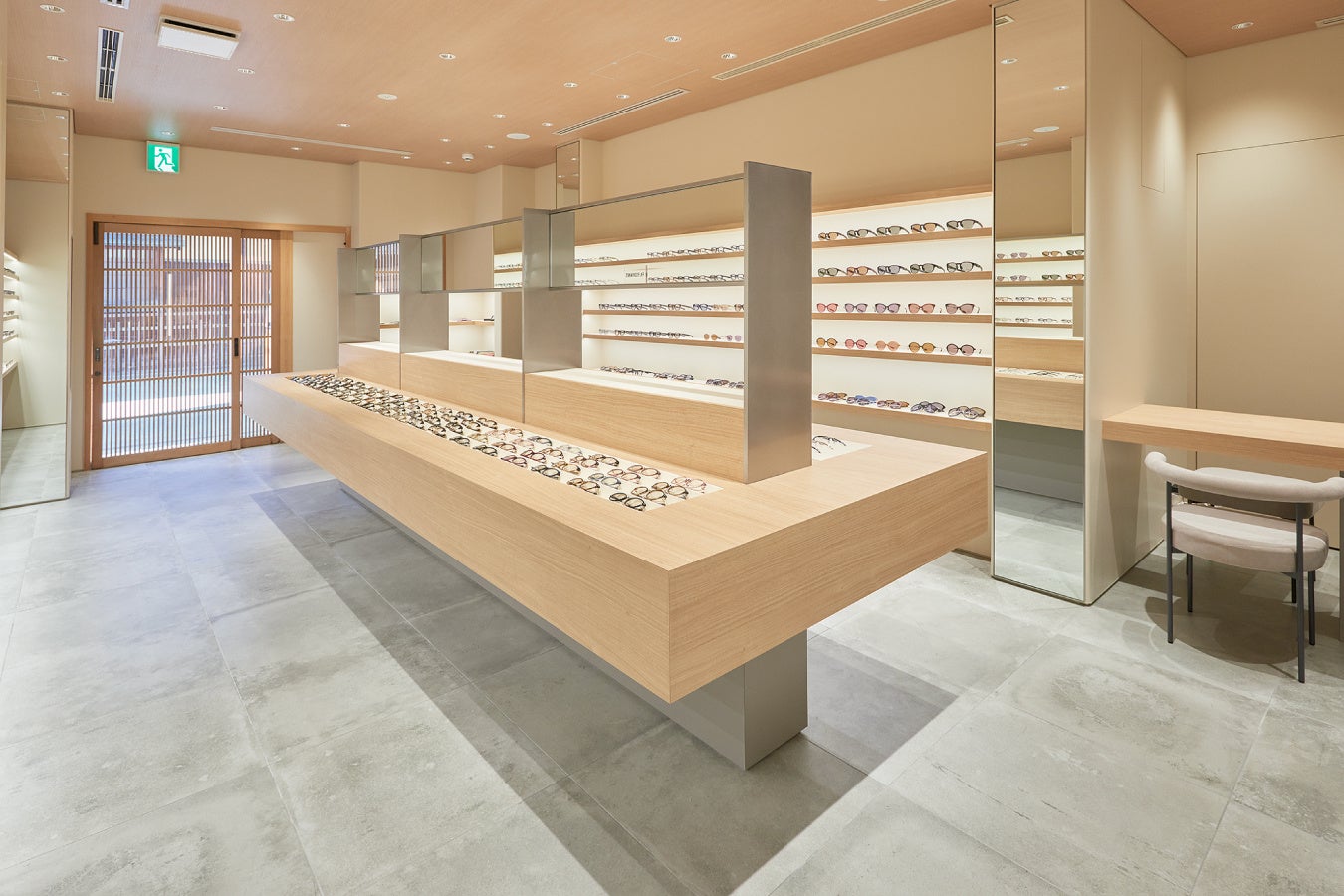 京都 祇園エリア初の路面店となる同店では、豊富なラインナップとともに、最新測定機器も取り揃えております。明るい木目調の店内でゆったりフレーム選びをお楽しみください。