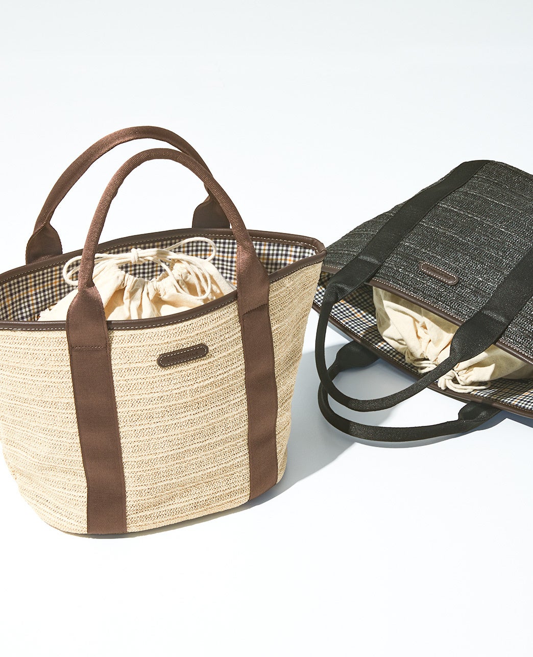 内側にクロコダイルタータンを使用した、巾着付きのかごバッグ。サマーシーズンのお出掛けに活躍するアイテムです。