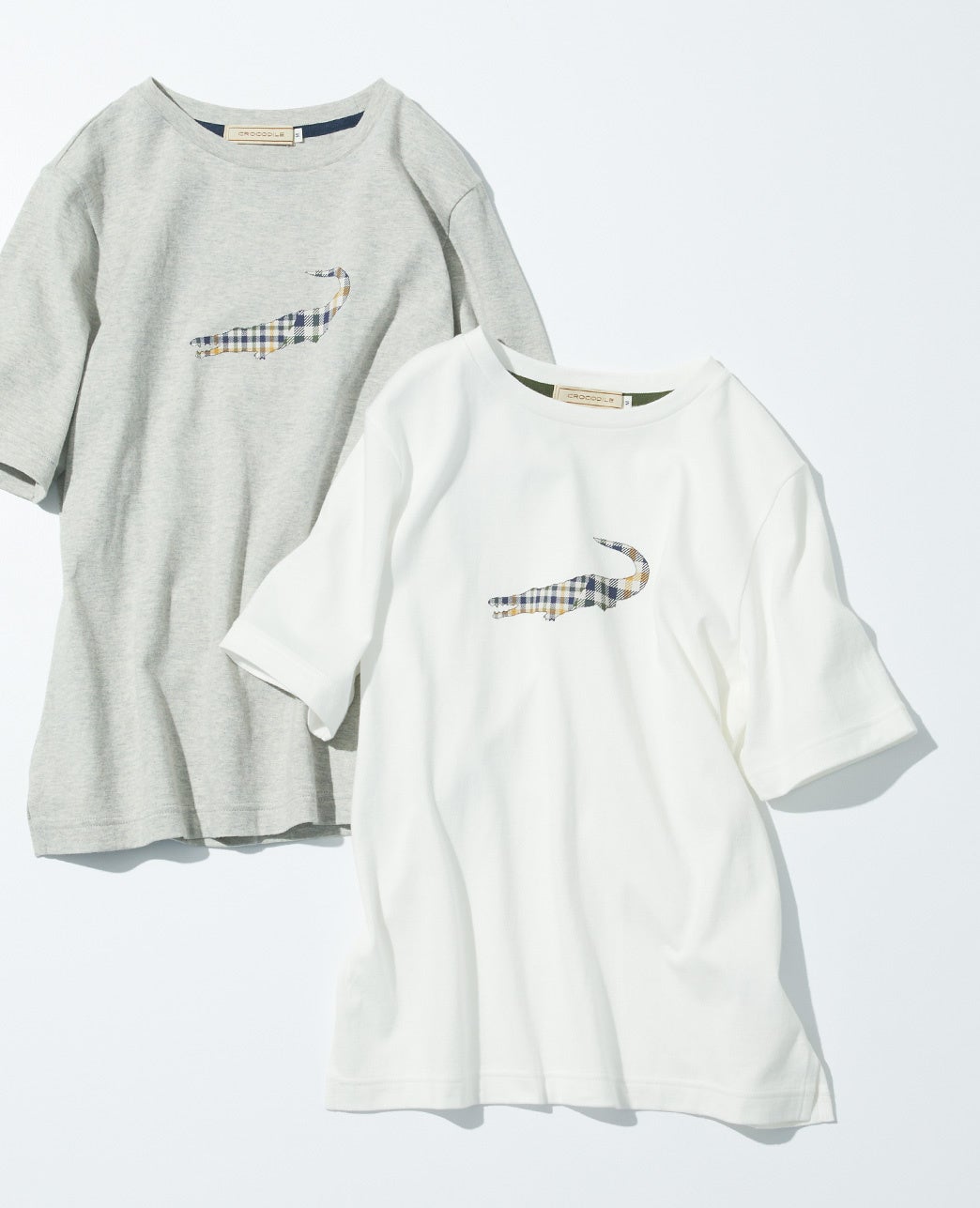 ワニシルエットをクロコダイルタータンのパッチワーク風に表現したプリントTシャツ。シンプルな中にもブランドアイコンを取り入れた一枚です。
