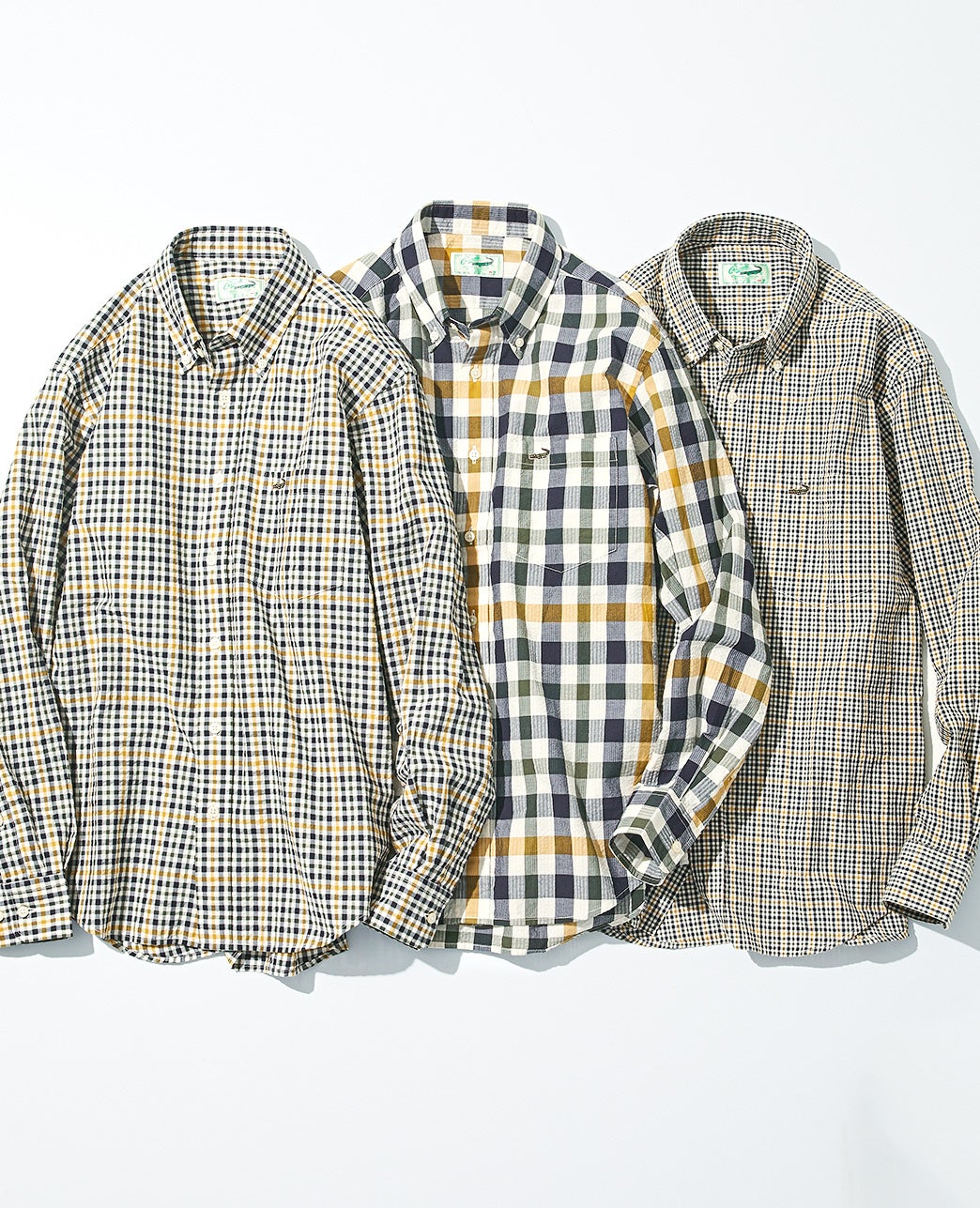 クロコダイルタータンを使用した長袖シャツ。それぞれ柄の大きさが異なる3種類でご用意。清涼感のあるサッカー生地なので汗ばむ季節に最適です。