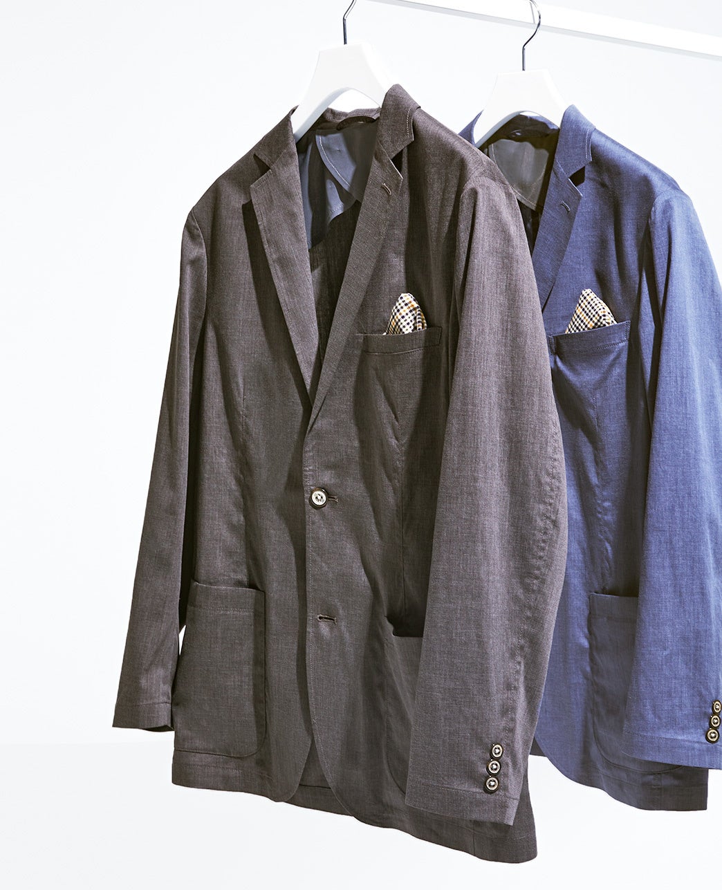 吸水速乾性のある素材を使用したジャケット。軽量かつストレッチ性にも優れ、快適な着心地を実現します。胸ポケットチーフにはクロコダイルタータンを使用。