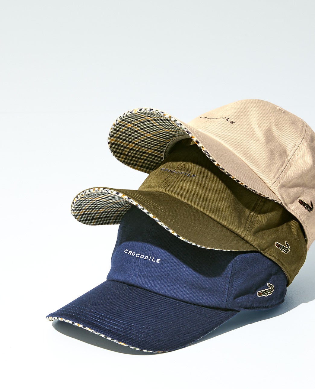 クロコダイルタータンをつばの裏側に使用した刺繍入りキャップ。被った時にさりげなく見えるチェック柄がコーディネートのアクセントになります。
