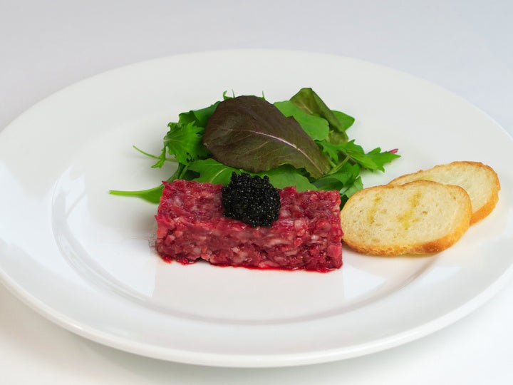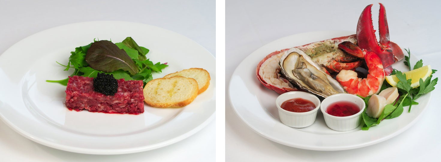 【Appetizer】黒毛和牛のタルタル キャビアを添えて(左) または シーフードプラッター 海からの贈り物(右)