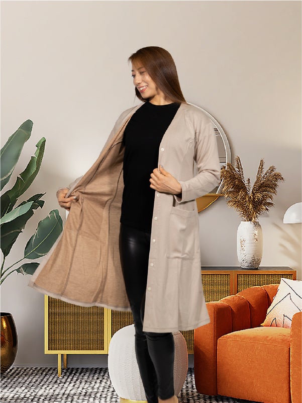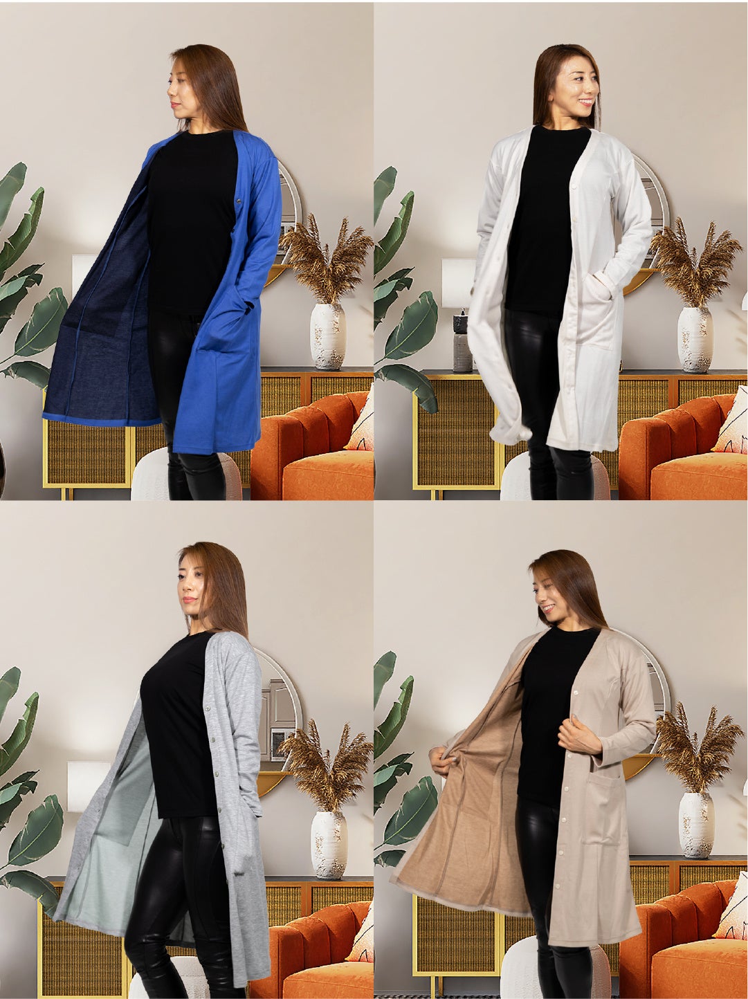 食事とは違い、身体の中からだけでなく身体の外から、そして1日中効果を得られるというのがこのIFMC.加工を施されたカーディガンのいいところです。