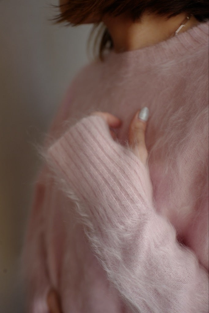 カシミヤ100%を贅沢に使用した、毛足の長い上品な光沢感のあるファーカシミヤカーディガン。