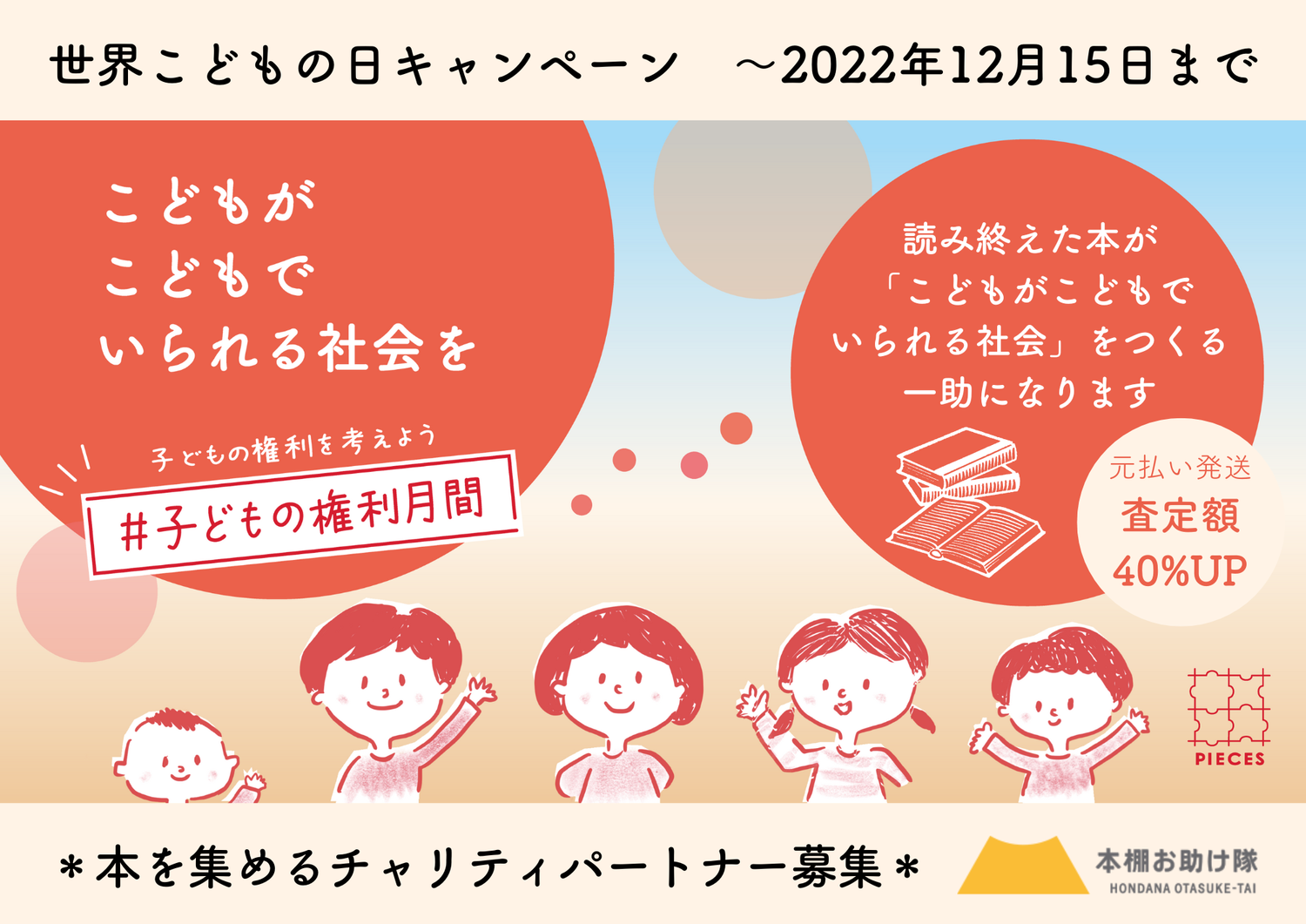 貧困や差別、虐待などを背景に子どもたちの尊厳がないがしろにされている出来事が多々起こっています。子どもの孤立の解消に取り組む認定NPO法人PIECESは、子どもたちが孤立することなく、尊厳を大切にされ生きていくことのできる社会を築いていくために、読み終えた本や書き損じはがきなどの回収及びキャンペーンに賛同・協力いただける企業・団体様を募集します。