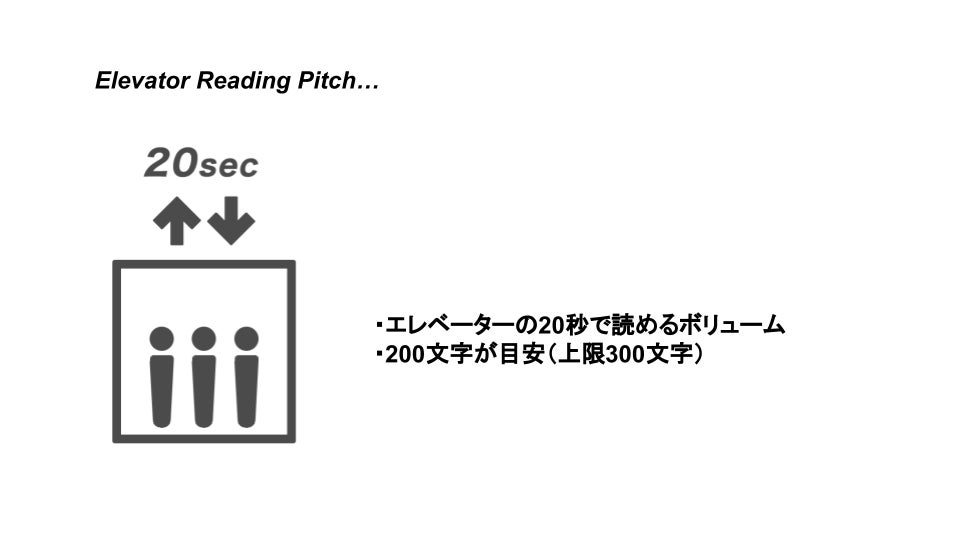 ・『エレベーターリーディング』ブロックは、エレベーターの20秒で読める分量の200文字目安、300文字を上限に、言葉や特長を研ぎ澄ませてアイデアを伝えることを意図した形式のものです
